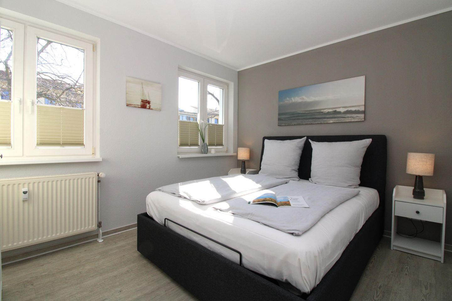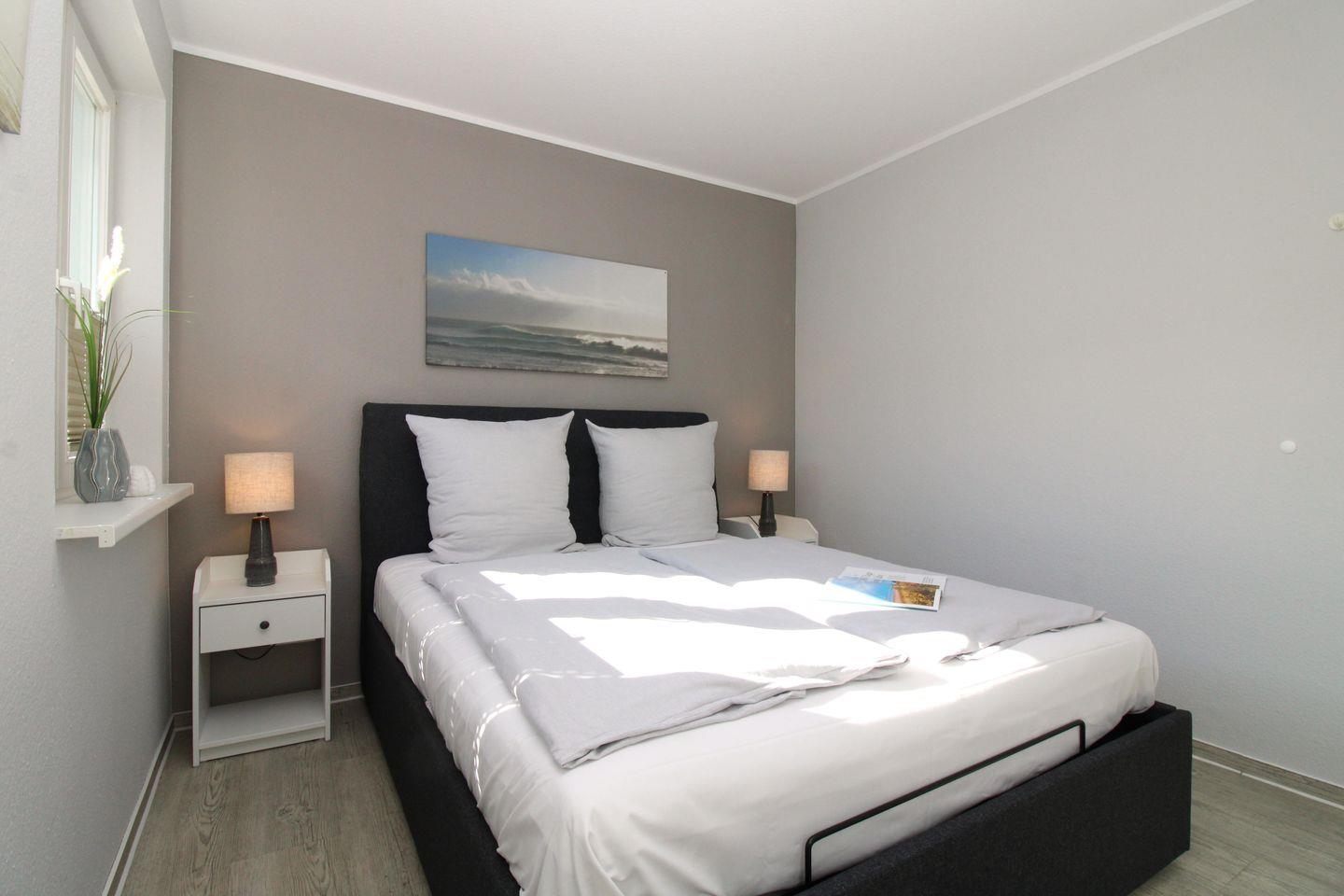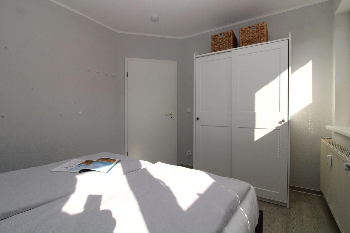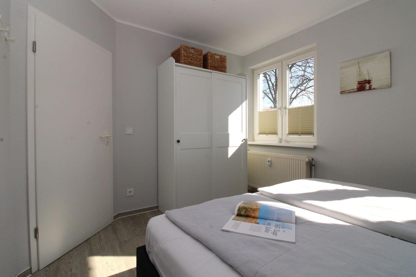 Das freundliche Schlafzimmer ist mit einem bequemen Boxspring-Doppelbett (2 x 80 cm x 200 cm), Nachttischen mit Nachttischlampen sowie einem geräumigen Kleiderschrank eingerichtet.