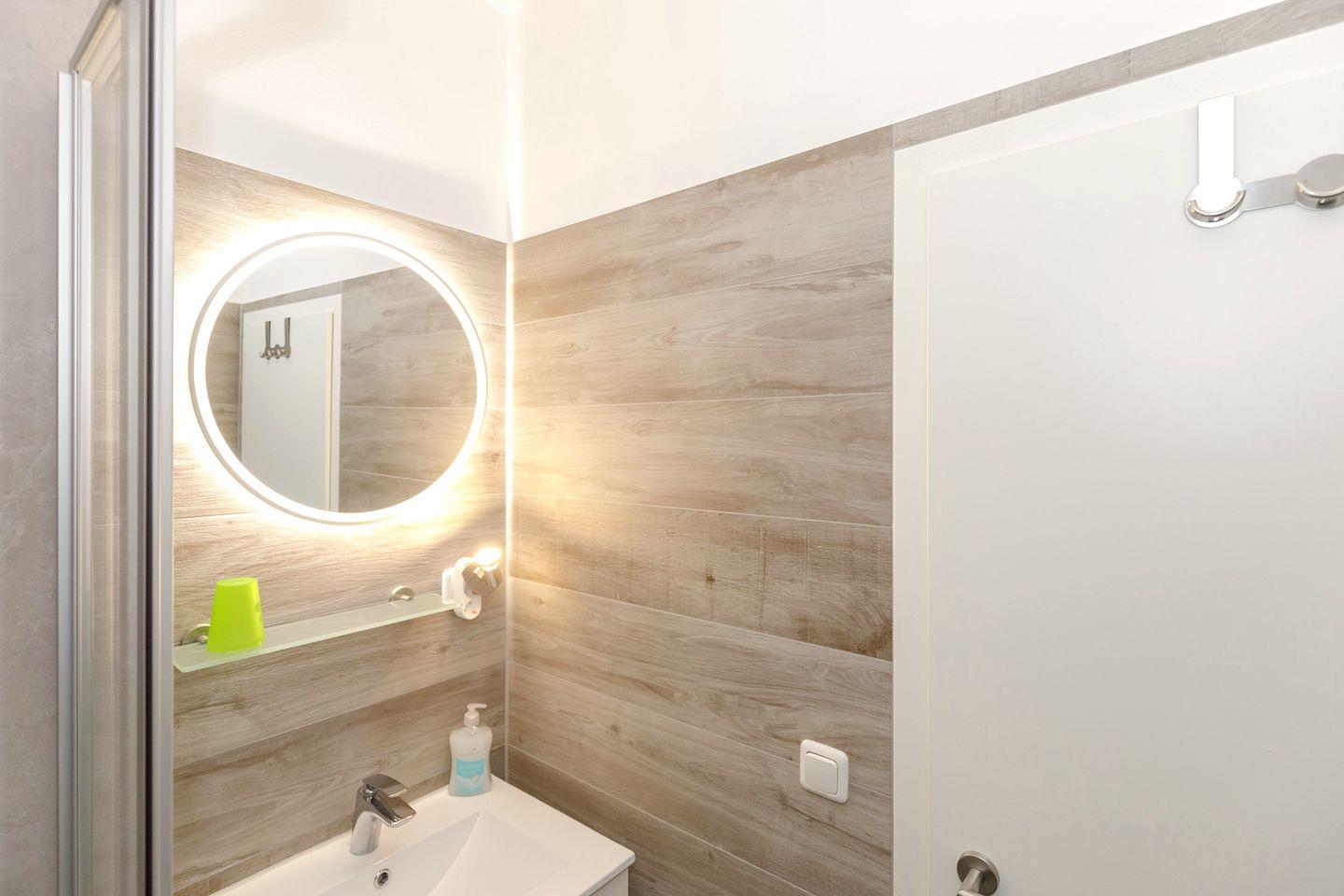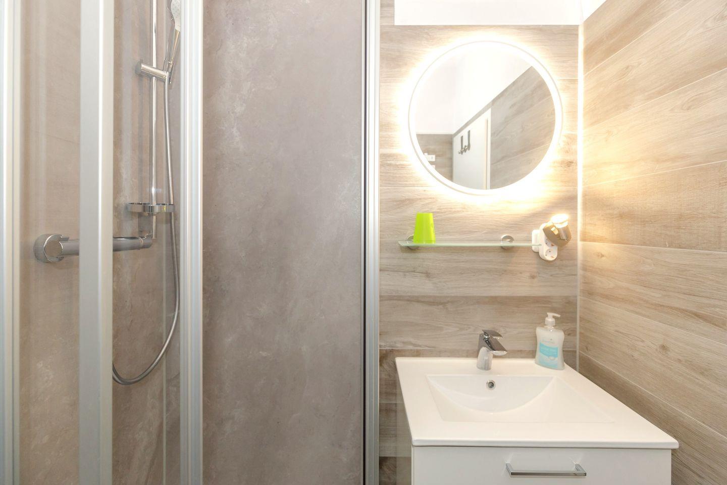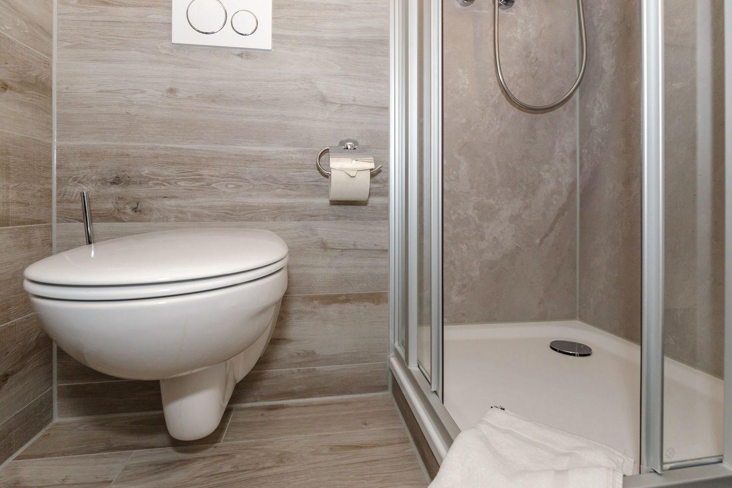 Das moderne Badezimmer verfügt über eine Echtglas-Dusche mit niedrigem Einstieg, Waschbecken mit Unterschrank, WC, Handtuch-Heizkörper, Föhn sowie ausreichend Ablagemöglichkeiten.