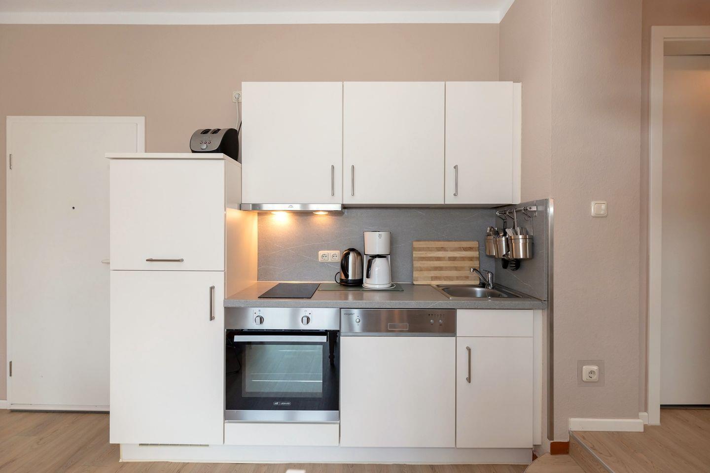 Die offene Küche beinhaltet eine voll ausgestattete Einbauküchenzeile mit 2-Zonen-Ceran-Kochfeld, Dunstabzug, Backofen, Kühlschrank mit Gefrierfach, Geschirrspülmaschine, Kaffeemaschine, Wasserkocher und Toaster. Die Küche ist mit Geschirr, Gläsern, Besteck und Töpfen komplett ausgestattet.