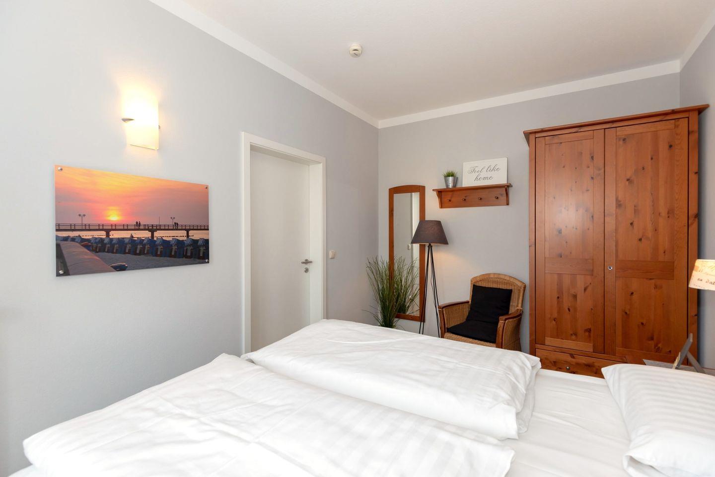 Das gemütliche 1. Schlafzimmer ist mit einem bequemen Boxspring-Doppelbett (160 cm x 200 cm), Nachttischen mit Nachttischlampen, einem geräumigen Kleiderschrank, einer Garderobenleiste, einem Wandspiegel sowie einem bequemen Korbsessel eingerichtet.