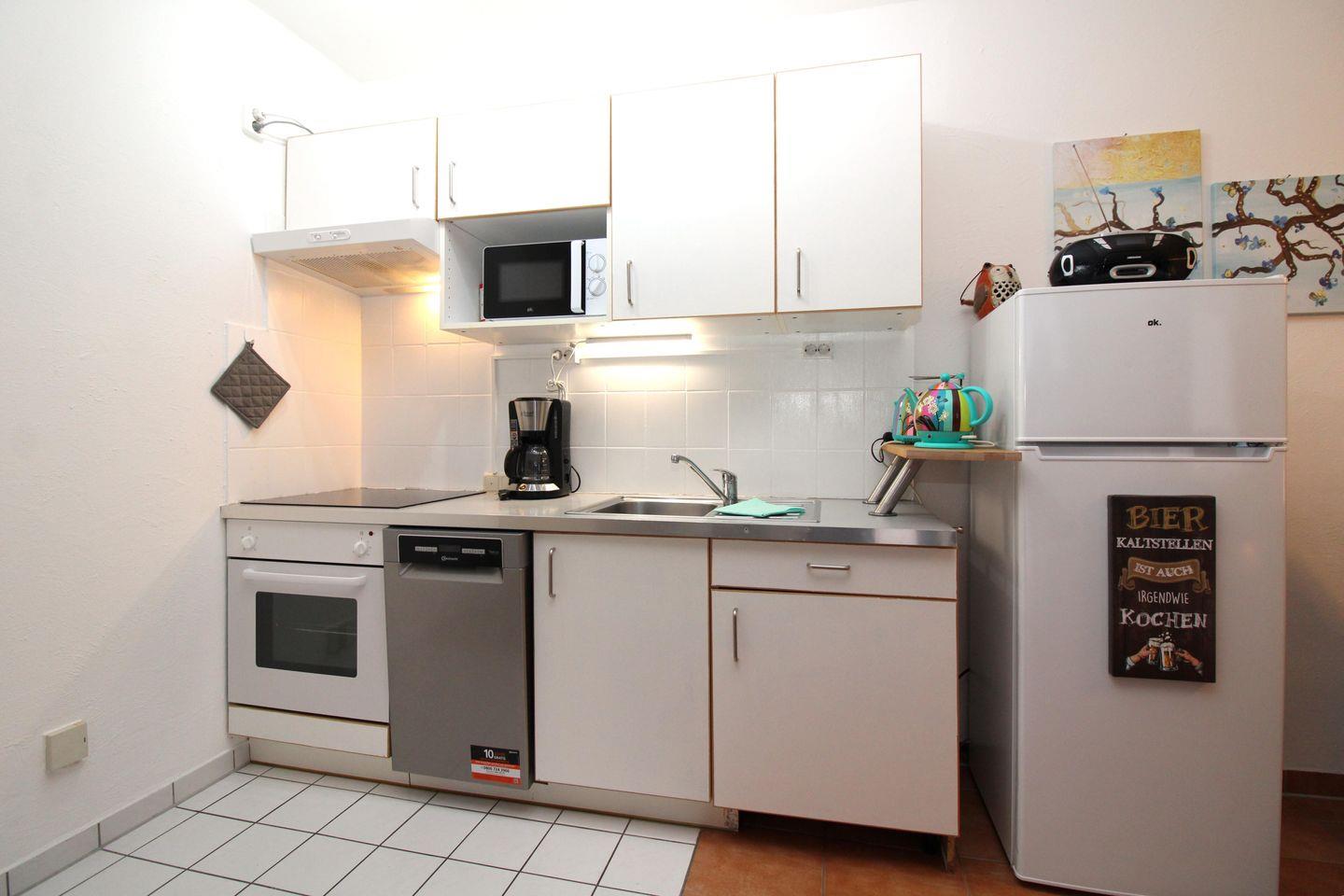 Der offene Küchenbereich beinhaltet eine voll ausgestattete Einbauküchenzeile mit 4-Zonen-Ceran-Kochfeld, Backofen, Dunstabzug, Mikrowelle, Kühlschrank mit Gefrierfach, Geschirrspülmaschine, Kaffeemaschine, Wasserkocher und Toaster. Die Küche ist mit Geschirr, Gläsern, Besteck und Töpfen komplett ausgestattet.