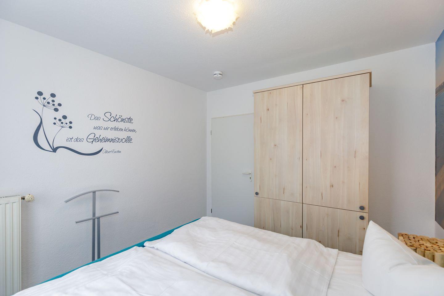 Das gemütliche Schlafzimmer ist mit einem bequemen Boxspring-Doppelbett (180 cm), Nachttischen mit Nachttischlampen, einem geräumigen Kleiderschrank sowie einem Kleiderständer eingerichtet.
