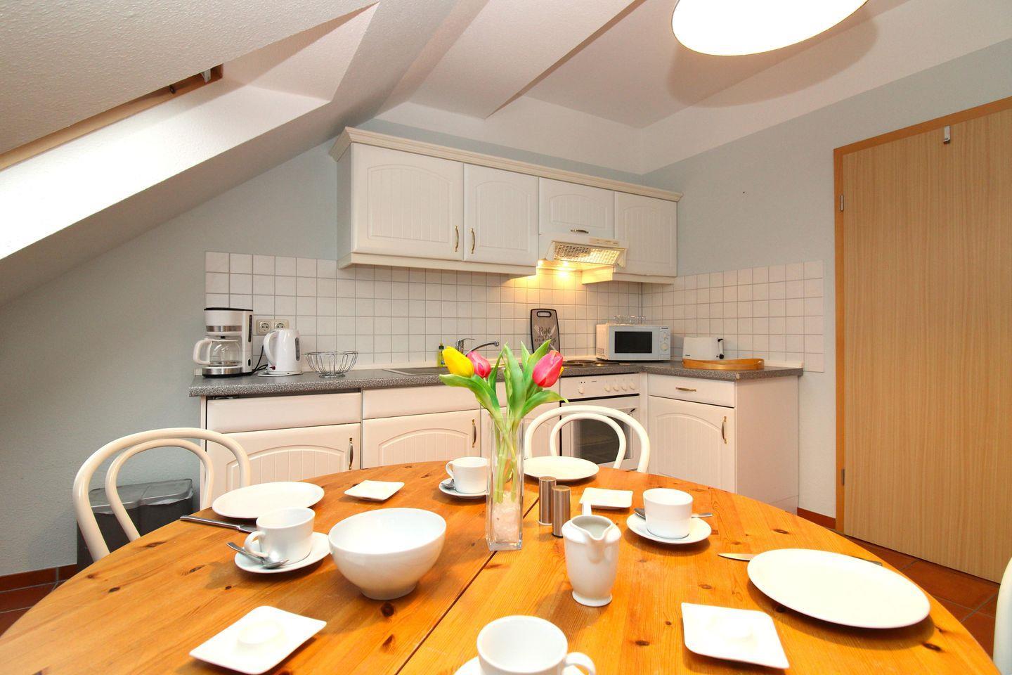 Die offene Küche beinhaltet eine voll ausgestattete Einbauküchenzeile mit 4-Platten-Herd, Backofen, Dunstabzug, Mikrowelle, Kühlschrank mit Gefrierfach, Kaffeemaschine, Wasserkocher und Toaster. Die Küche ist mit Geschirr, Gläsern, Besteck und Töpfen komplett ausgestattet.