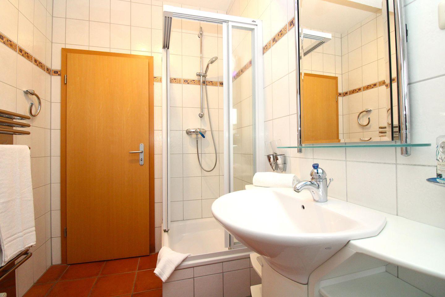 Das helle Badezimmer (mit Tageslicht / Fenster) verfügt über eine Dusche mit Echtglas-Duschabtrennung, Waschbecken mit Unterschrank, WC, einen Handtuch-Heizkörper sowie ausreichend Ablagemöglichkeiten.
