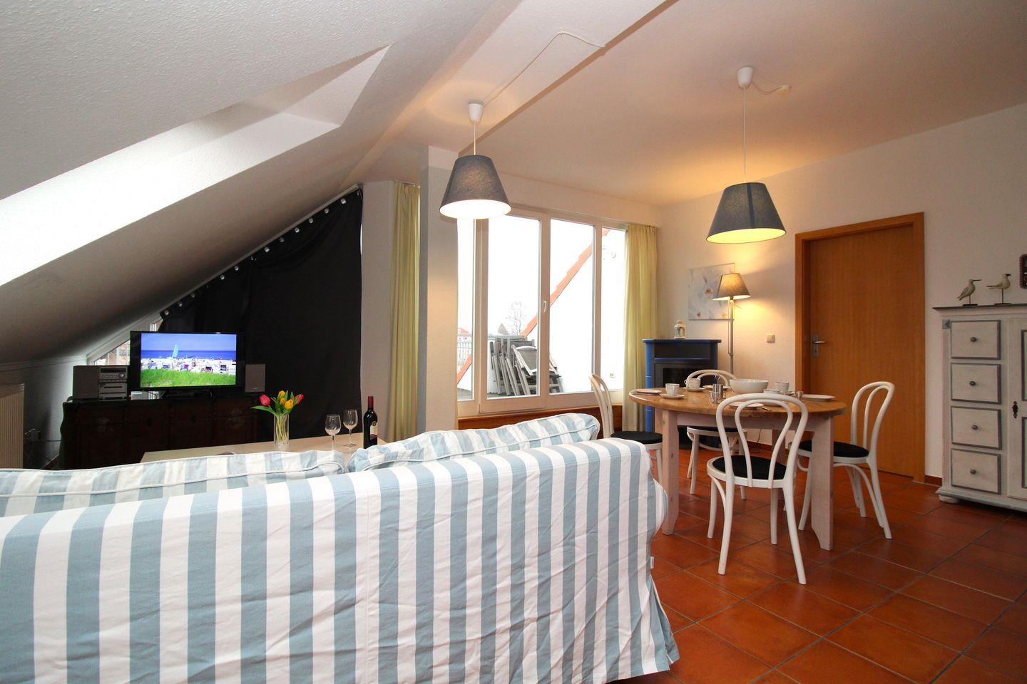Das freundliche und geräumige Wohn-/Esszimmer verfügt über eine separate Sitzgruppe mit bequemer Couch, Couchtisch, einen separaten Esstisch mit 4 Stühlen sowie ein Sideboard. Vom Wohnzimmer aus haben Sie direkten Zugang zu der ca. 17 m² großen und sonnigen Dachterrasse. Hier sitzen Sie entspannt und gemütlich mit weitem Blick über die Dächer von Kühlungsborn und können sich ausgiebig sonnen oder abends bei einem guten Glas Wein in Ruhe die lauen Sommernächte genießen!