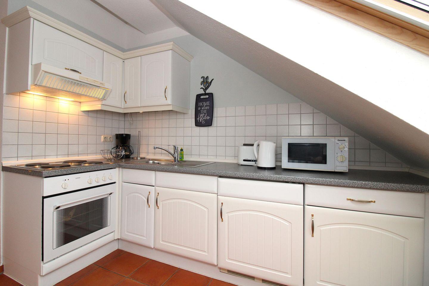 Die offene Küche beinhaltet eine voll ausgestattete Einbauküchenzeile mit 4-Platten-Herd, Backofen, Dunstabzug, Mikrowelle, Kühlschrank mit Gefrierfach, Kaffeemaschine, Wasserkocher und Toaster. Die Küche ist mit Geschirr, Gläsern, Besteck und Töpfen komplett ausgestattet.