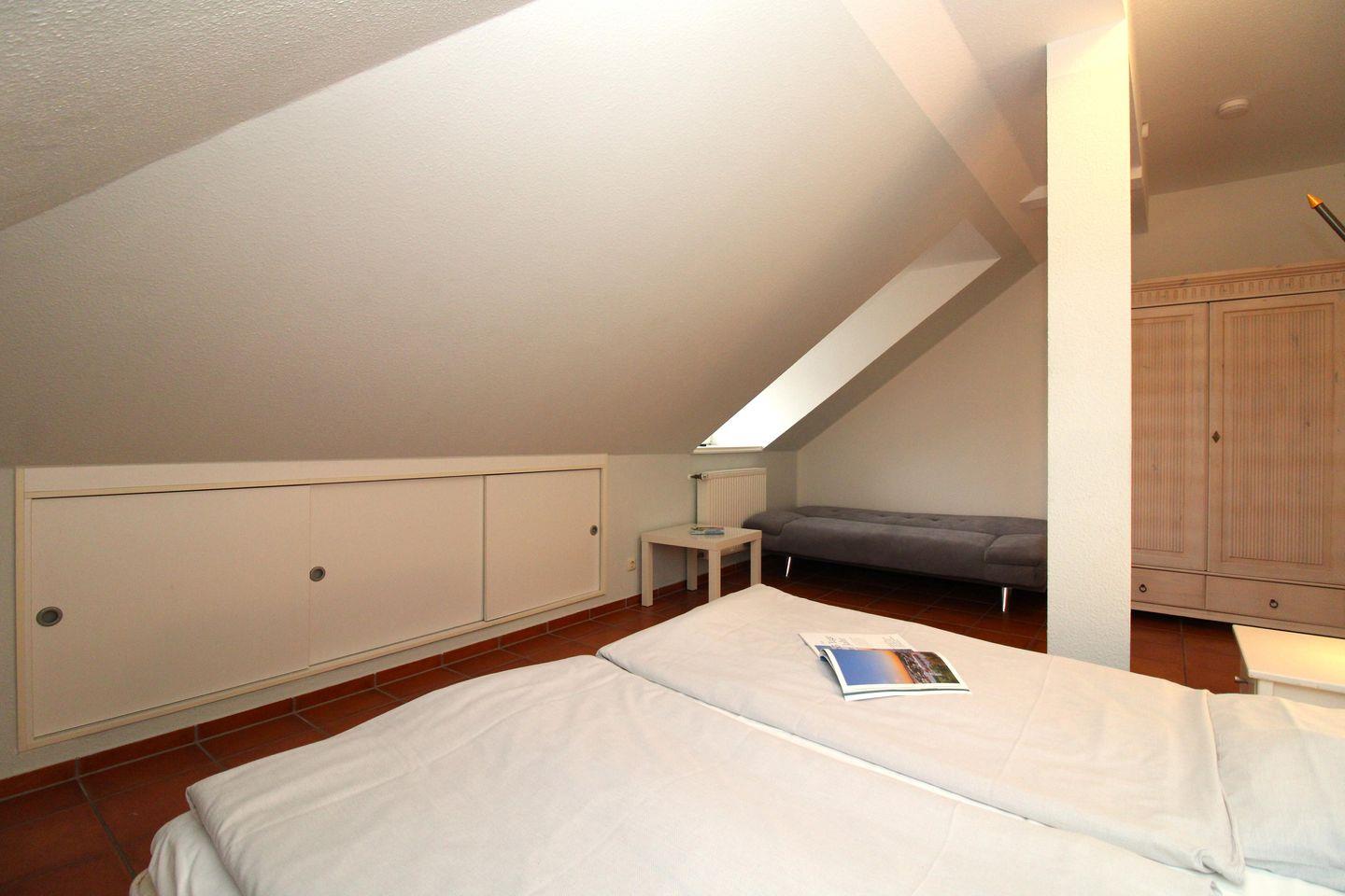 Das gemütliche Schlafzimmer ist mit einem bequemen Doppelbett (180 cm x 200 cm), Nachttischen mit Nachttischlampen sowie einem geräumigen Kleiderschrank eingerichtet. In den Dachschrägen sind als zusätzlicher Stauraum für Ihre Garderobe und Ihr Reisegepäck mehrere geräumige Einbauschränke eingebaut.