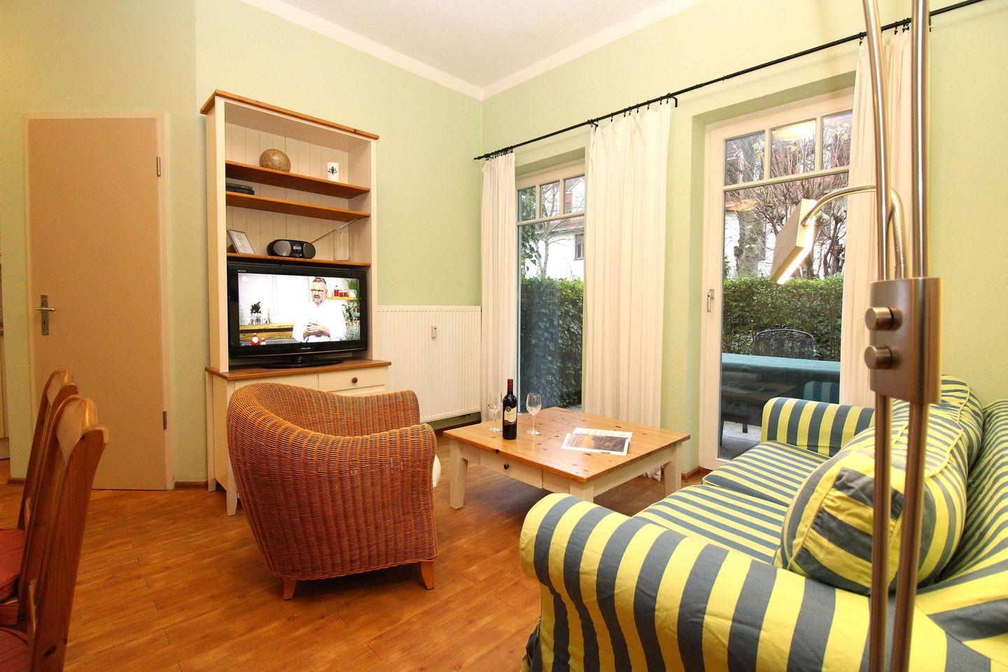 Das gemütliche Wohn-/Esszimmer verfügt über eine separate Sitzgruppe mit bequemer Couch, Korbsessel und Couchtisch, einen separaten Esstisch mit 6 Stühlen, einen Schrank sowie eine Vitrine. Vom Wohnzimmer aus haben Sie direkten Zugang zu der ca. 10 m² großen und sonnigen Terrasse (nach Süden ausgerichtet) mit Terrassenmöbeln. Hier sitzen Sie entspannt und gemütlich im Grünen und können abends bei einem guten Glas Wein in Ruhe die lauen Sommernächte genießen!