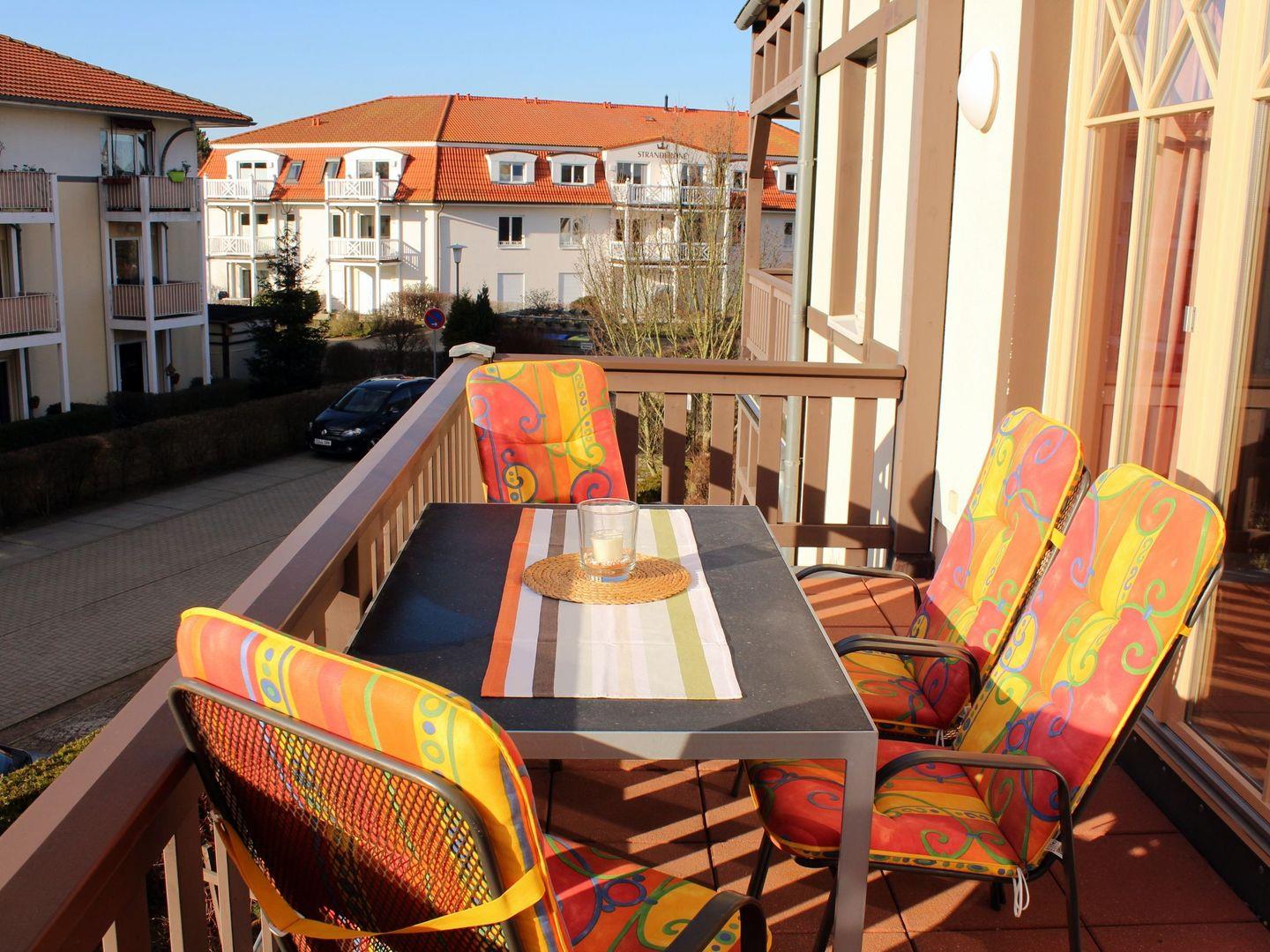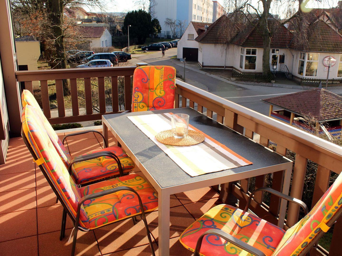 Vom Wohnzimmer aus haben Sie direkten Zugang zu dem ca. 10 m² großzügigen Balkon (nach Westen ausgerichtet) mit Balkonmöbeln (Tisch und 4 Stühle). Hier sitzen Sie entspannt und gemütlich und können abends bei einem guten Glas Wein in Ruhe die lauen Sommernächte genießen!