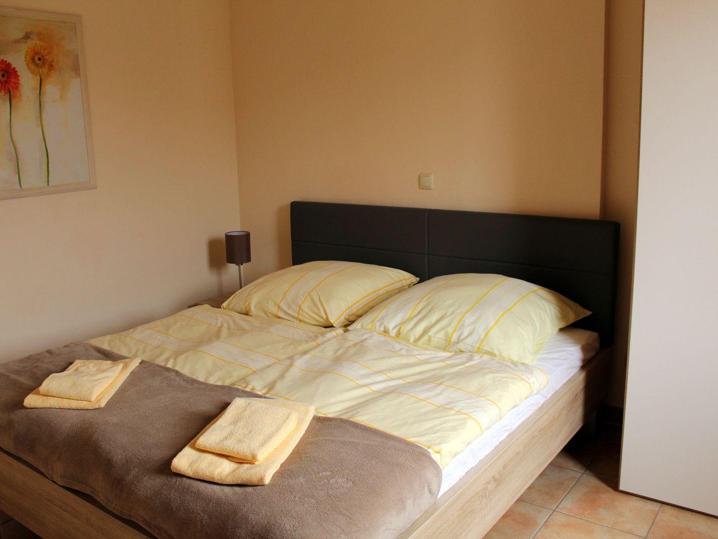Das separate und zusätzliche 2. Schlafzimmer verfügt ebenfalls über ein bequemes Doppelbett (2 x 90 cm x 200 cm), Nachttisch mit Nachttischlampe, einen geräumigen Kleiderschrank sowie eine Kofferablage.