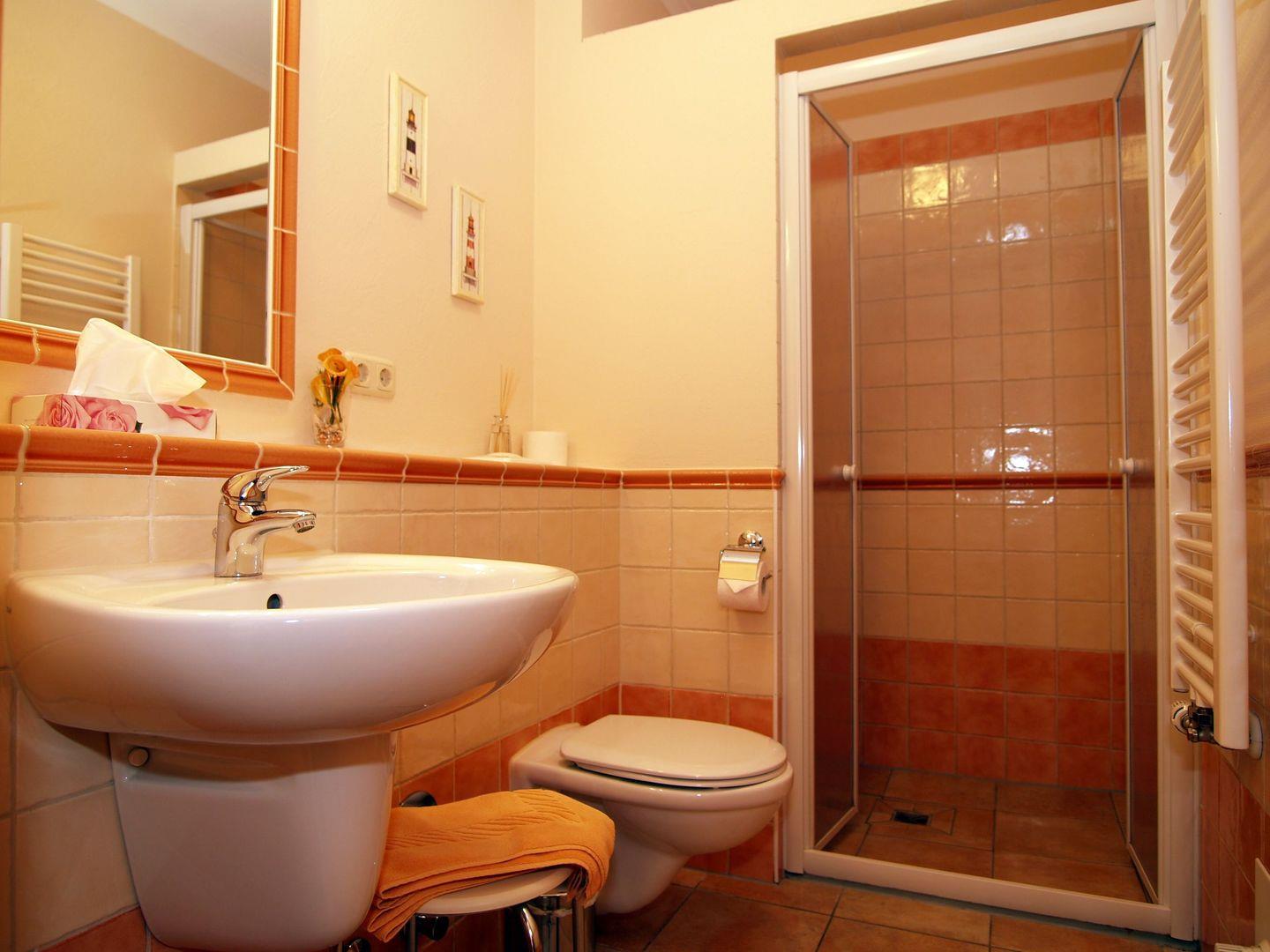 Das mediterran anmutende Badezimmer verfügt über eine Dusche mit bodengleichem Einstieg (seniorenfreundlich!), Waschbecken und WC, Föhn, Hocker, Handtuch-Heizkörper sowie ausreichend Ablagemöglichkeiten.
