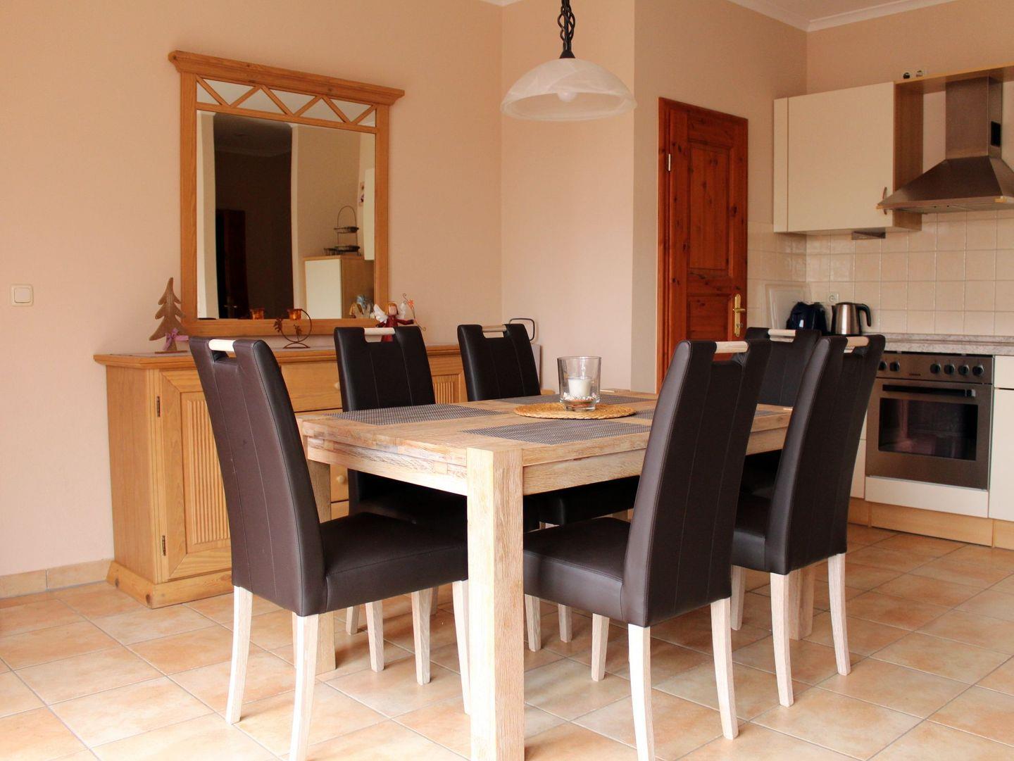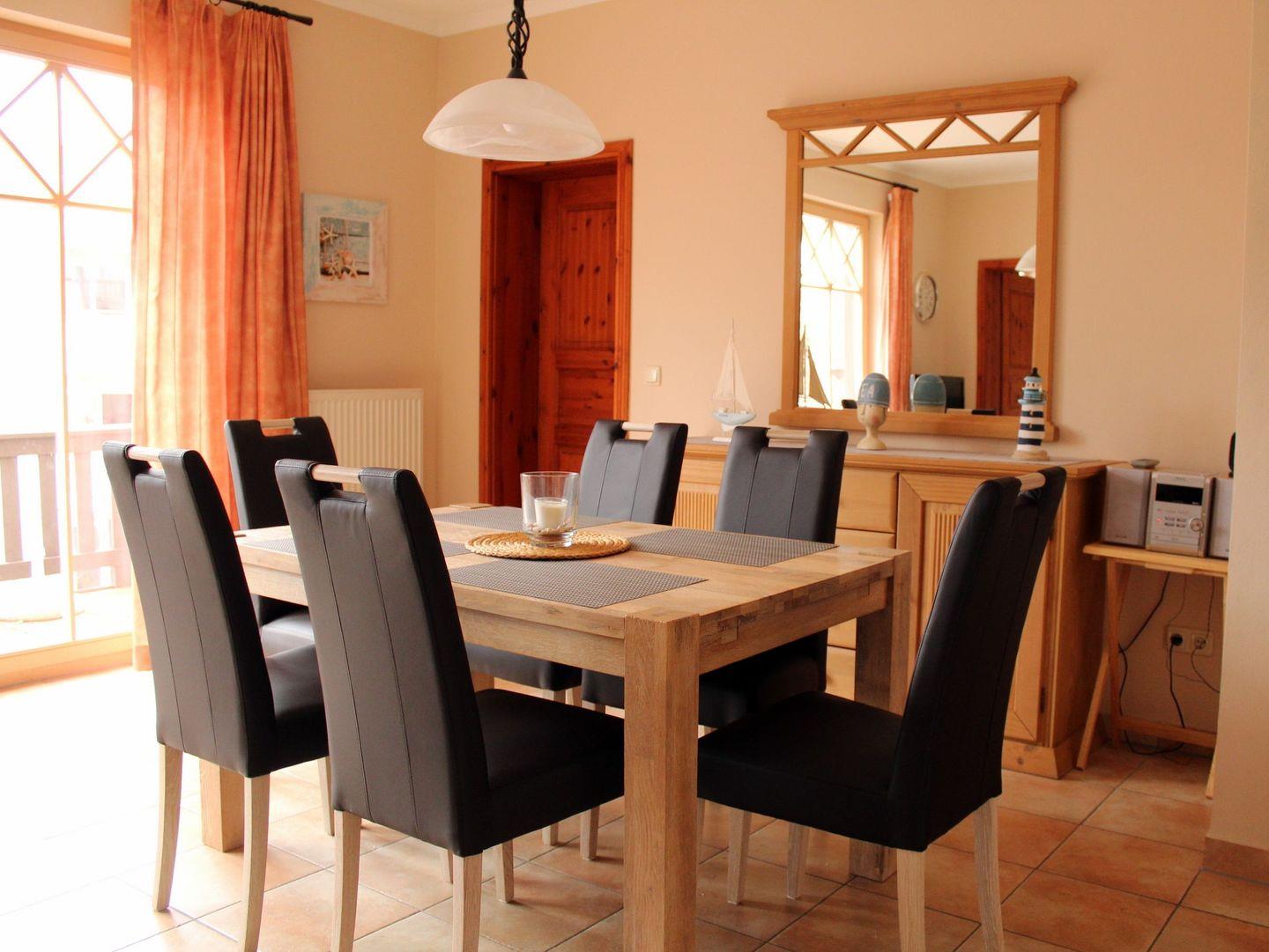 Das freundliche, sehr geräumige und helle Wohn-/Esszimmer verfügt über eine separate Sitzgruppe mit bequemer Couch, Sessel und Couchtisch, einen separaten Esstisch mit 6 Stühlen sowie ein geräumiges Sideboard.