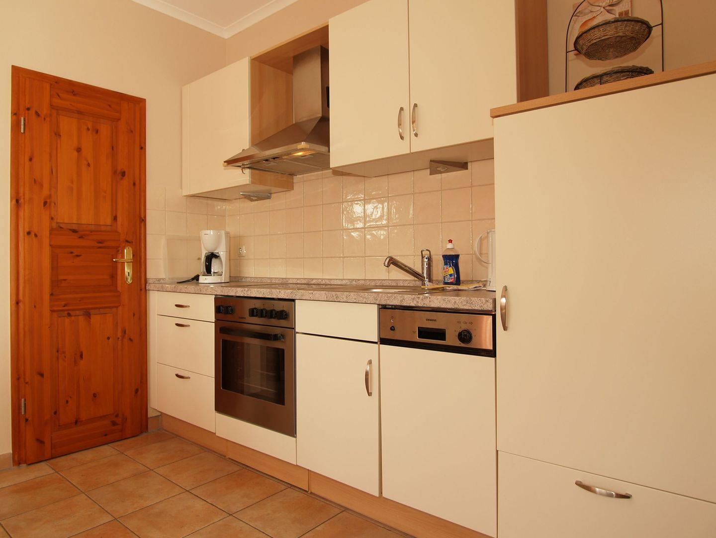 Die offene Küche beinhaltet eine voll ausgestattete Einbauküchenzeile mit 4-Zonen-Ceran-Kochfeld, Backofen, Dunstabzug, Mikrowelle, Kühlschrank mit Gefrierfach, Geschirrspülmaschine, Kaffeemaschine, Wasserkocher und Toaster. Die Küche ist mit Geschirr, Gläsern, Besteck und Töpfen komplett ausgestattet.