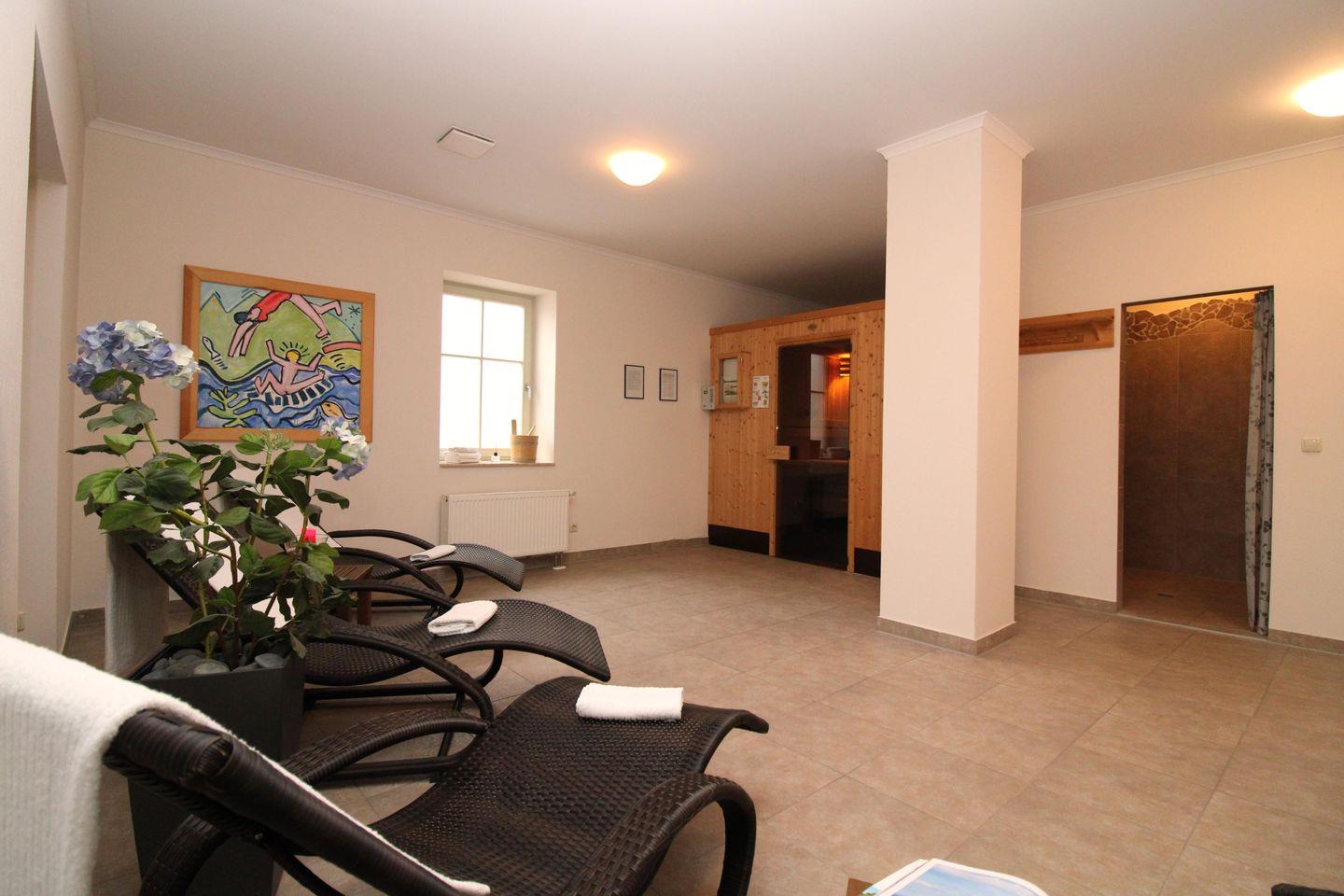 Im Erdgeschoss der Wohnanlage steht Ihnen gegen Münzeinwurf eine schöne Sauna-Anlage mit Ruheraum zur Verfügung.