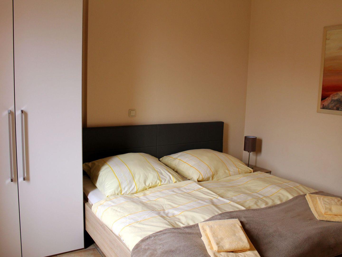 Das freundliche 1. Schlafzimmer ist mit einem bequemen Doppelbett (2 x 90 cm x 200 cm), Nachttisch mit Nachttischlampe, einem geräumigen Kleiderschrank sowie einer Kofferablage eingerichtet.