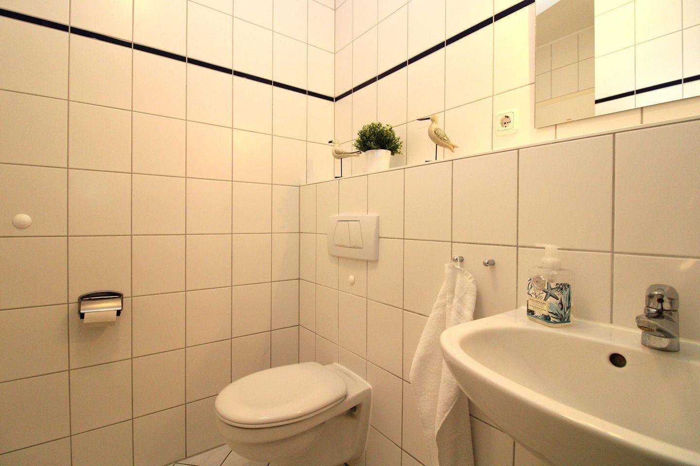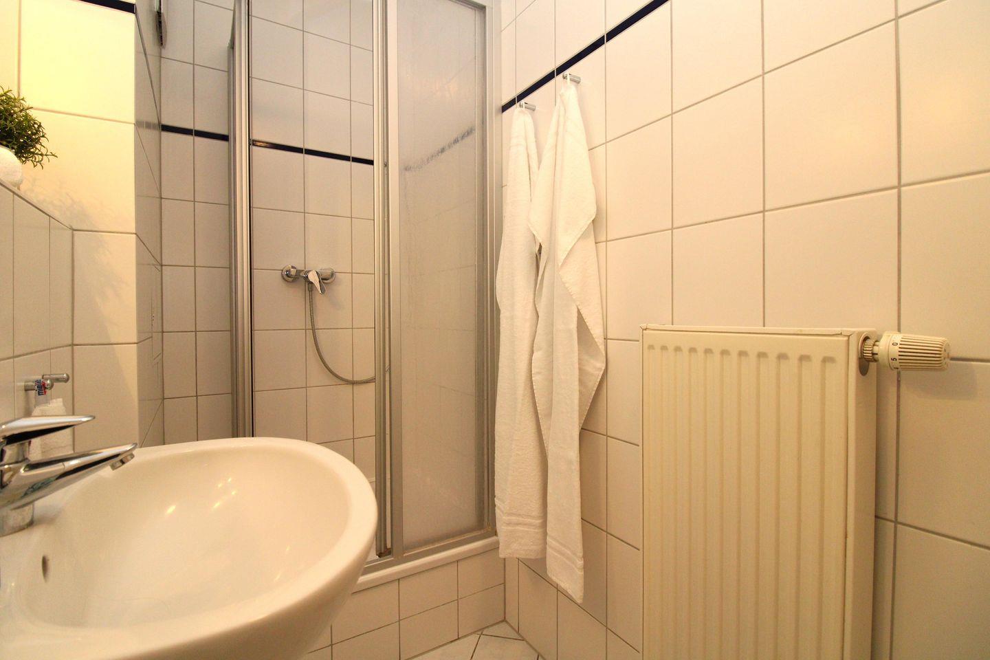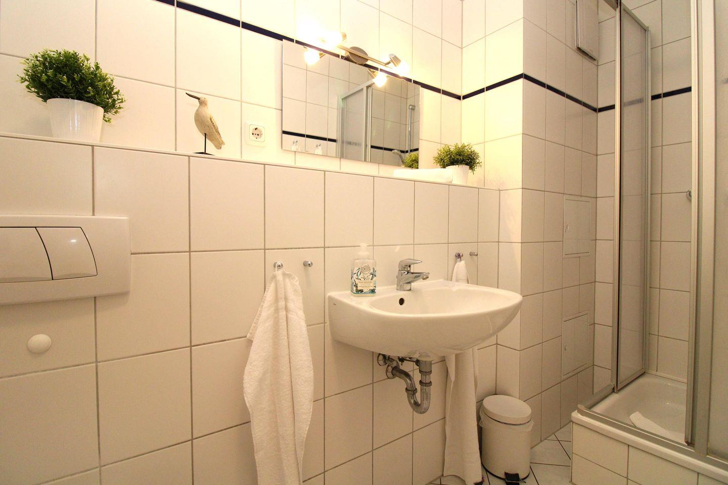 Das helle Badezimmer verfügt über eine Dusche, Waschbecken und WC sowie ausreichend Ablagemöglichkeiten.