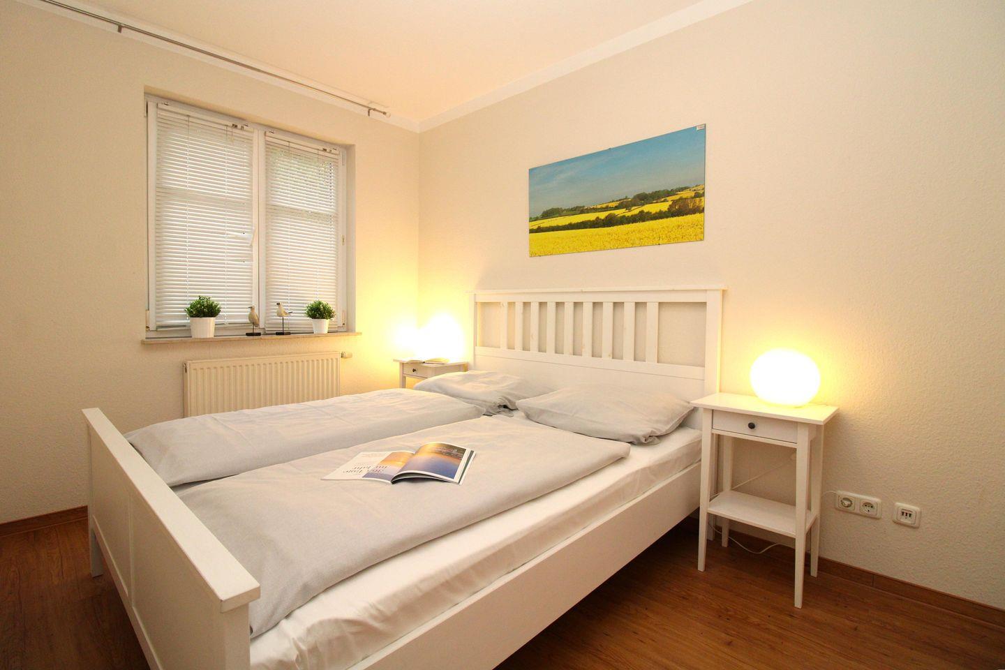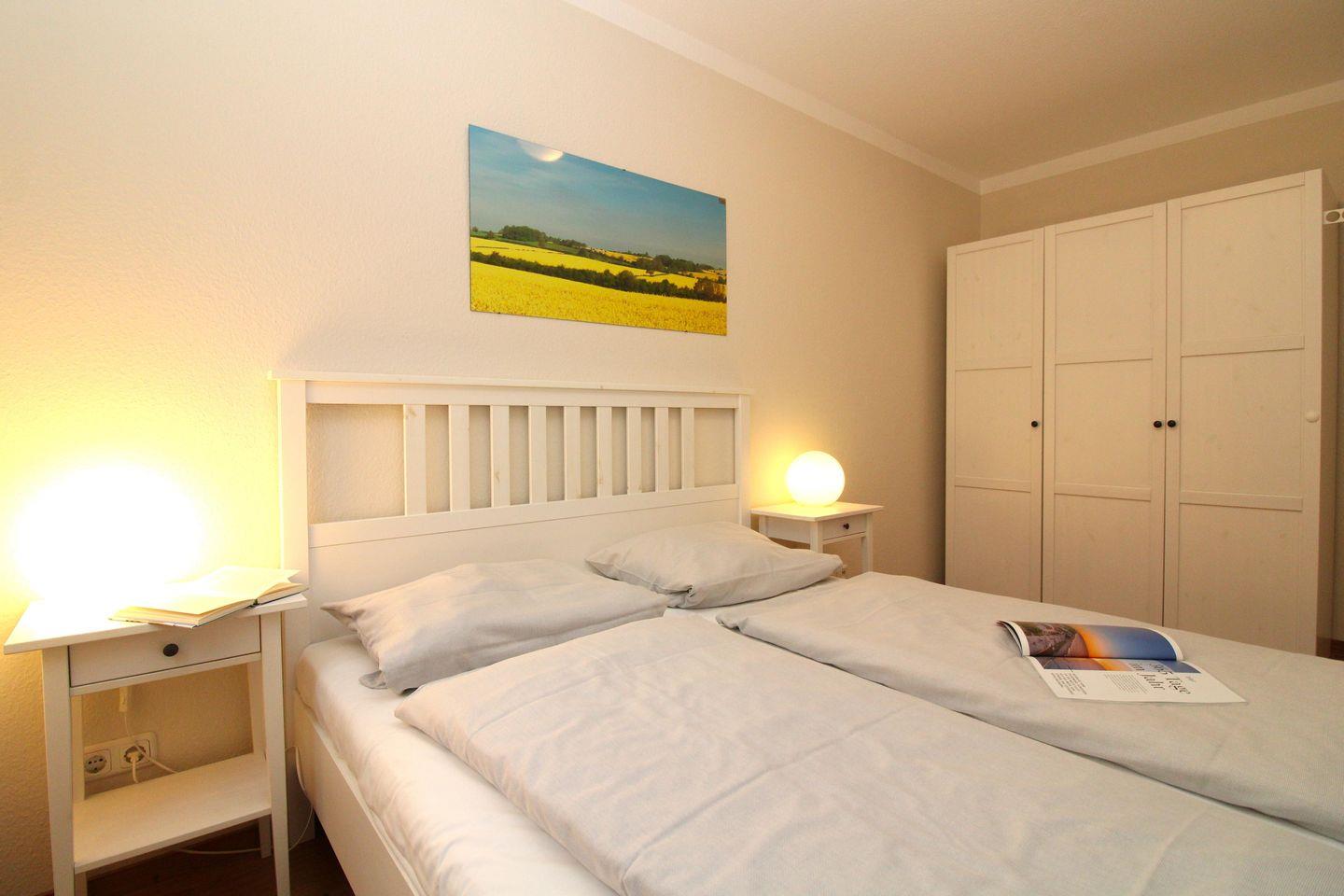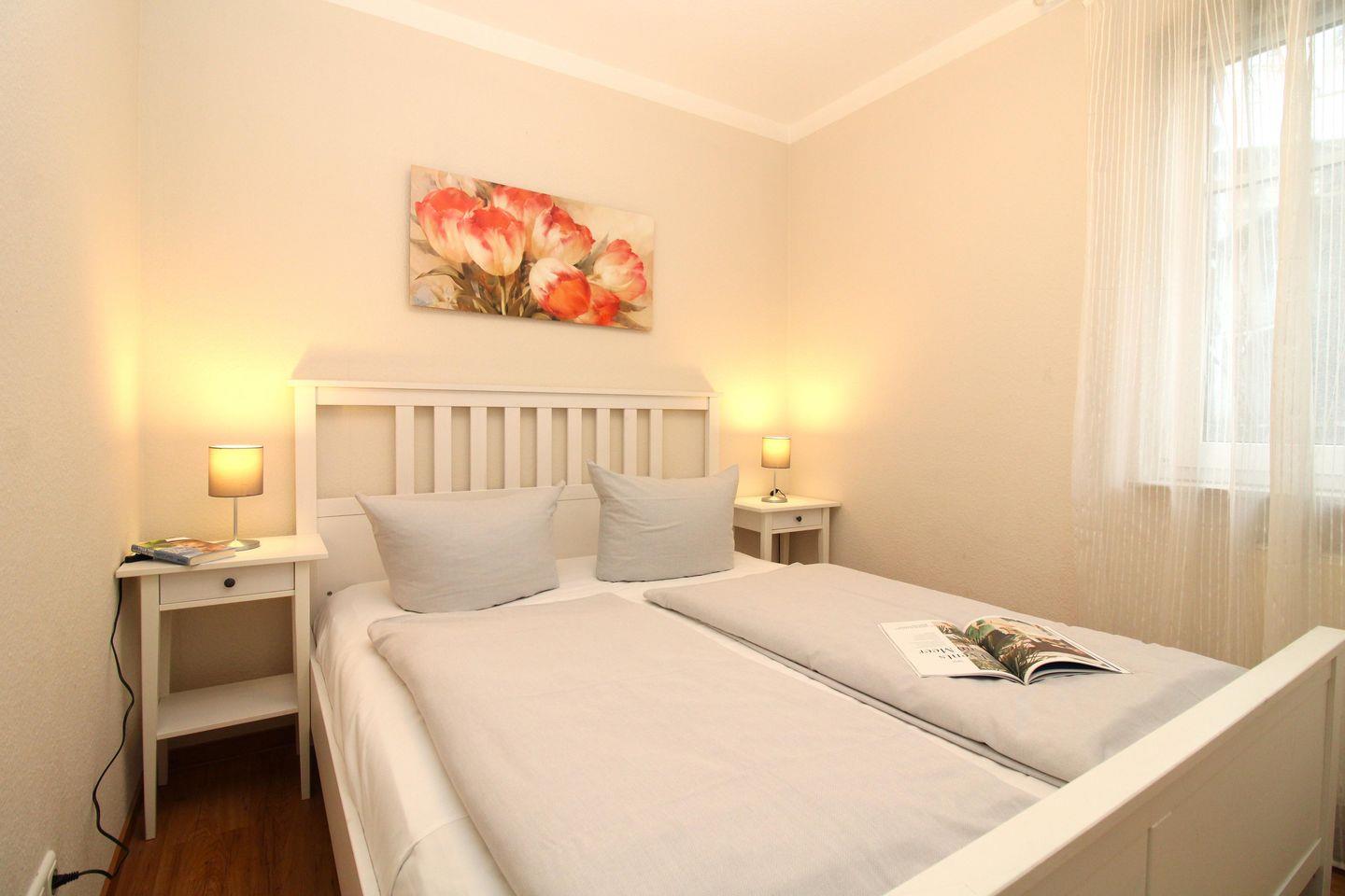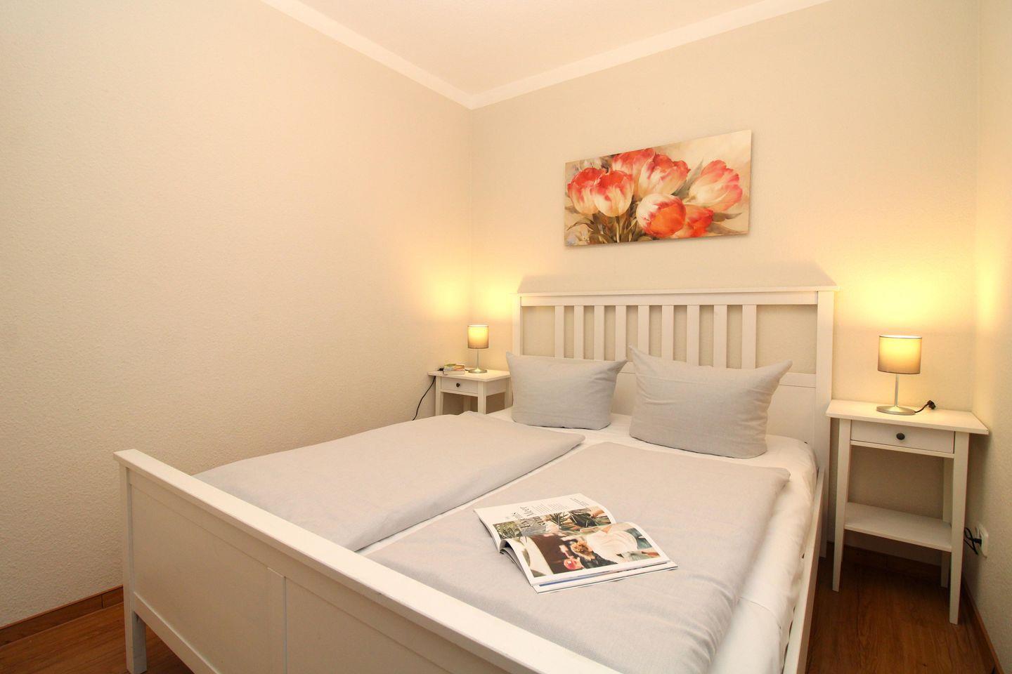 Das gemütliche 1. Schlafzimmer ist mit einem bequemen Doppelbett (160 x 200 cm), Nachttischen mit Nachttischlampen sowie einem Kleiderschrank (im Wohnzimmer) ausgestattet.
