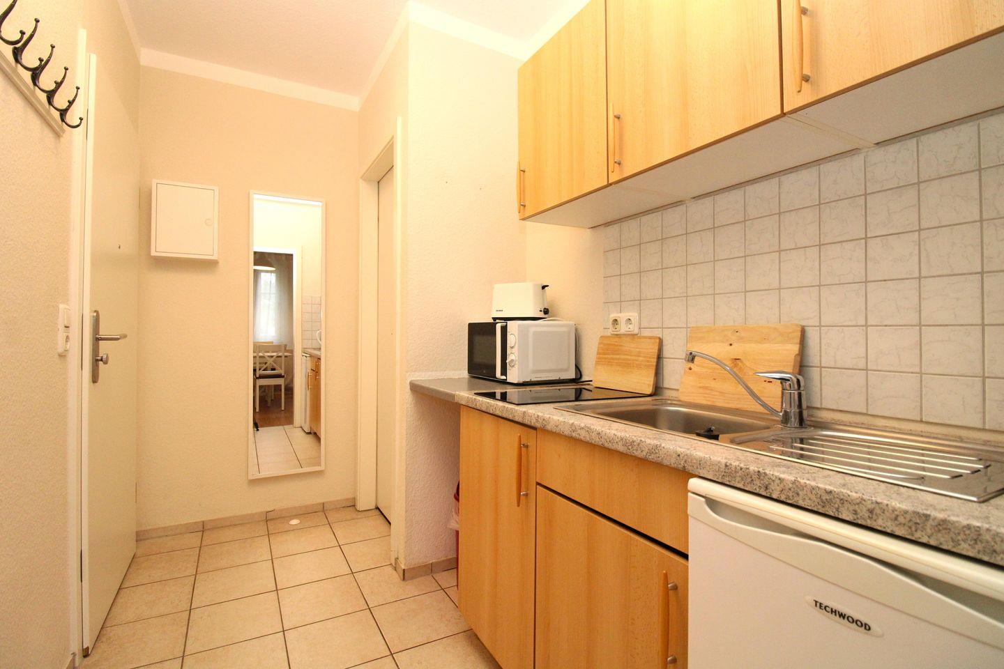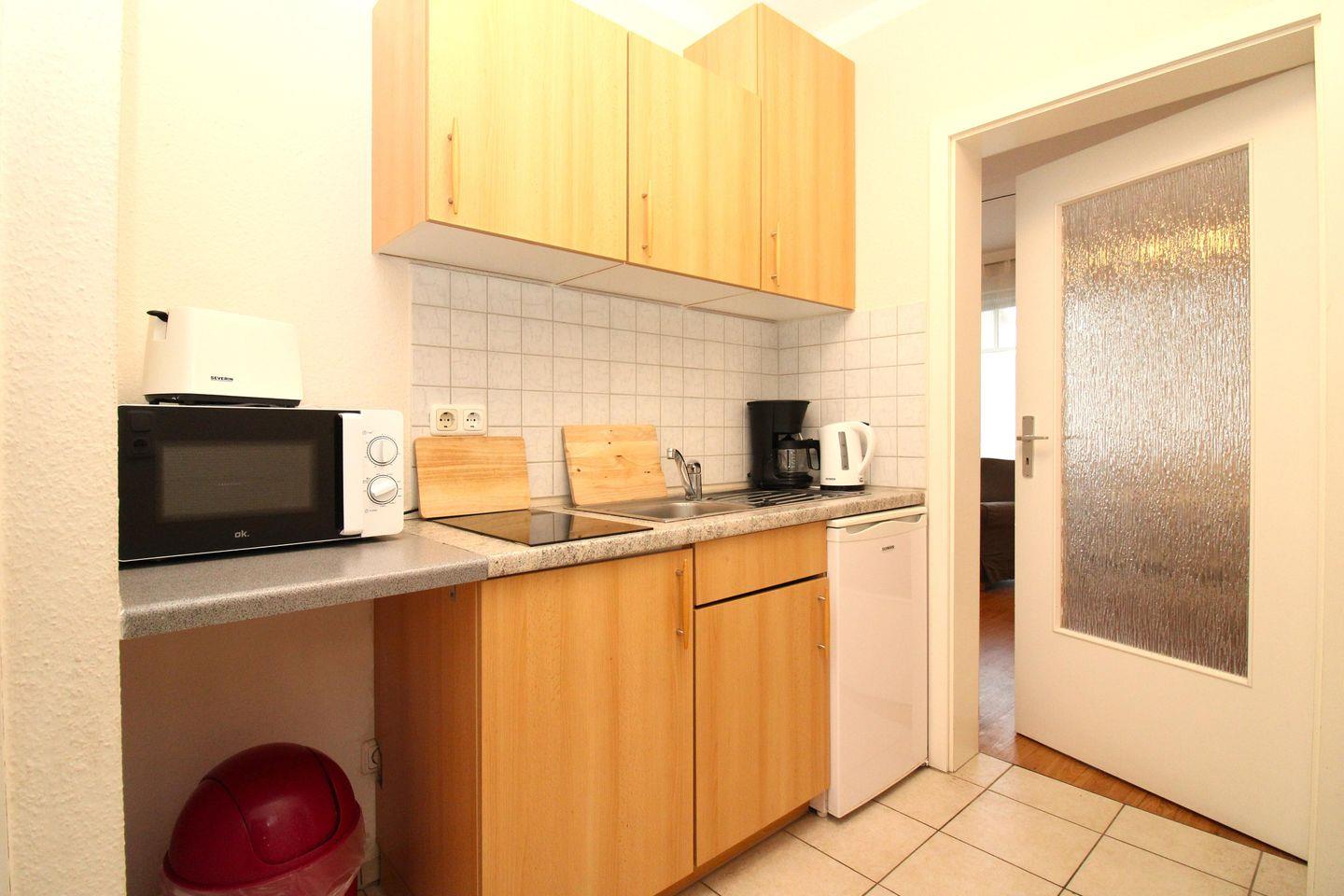Der separate Küchenbereich beinhaltet eine Pantry-Küche mit 2-Zonen-Ceran-Kochfeld, Mikrowelle, Kühlschrank mit Gefrierfach, Kaffeemaschine, Wasserkocher und Toaster. Die Küche ist mit Geschirr, Gläsern, Besteck und Töpfen komplett ausgestattet.