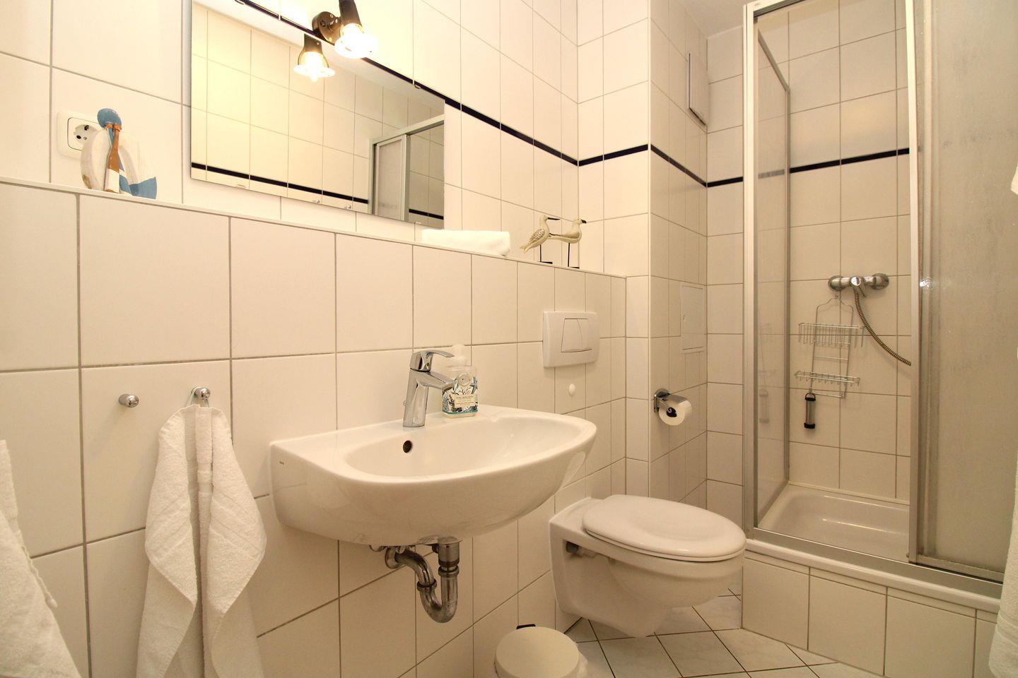 Das helle Badezimmer verfügt über eine Dusche, Waschbecken und WC sowie ausreichend Ablagemöglichkeiten.
