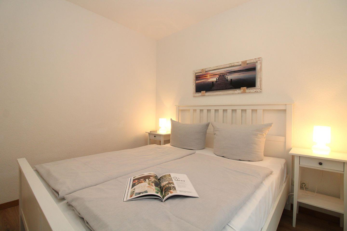 Das gemütliche Schlafzimmer ist mit einem bequemen Doppelbett (160 x 200 cm), Nachttischen mit Nachttischlampen sowie einem Kleiderschrank und einer Kommode (im Wohnzimmer) ausgestattet. Das Schlafzimmer verfügt über ein TV-Gerät und bietet ebenfalls Zugang zum Balkon.