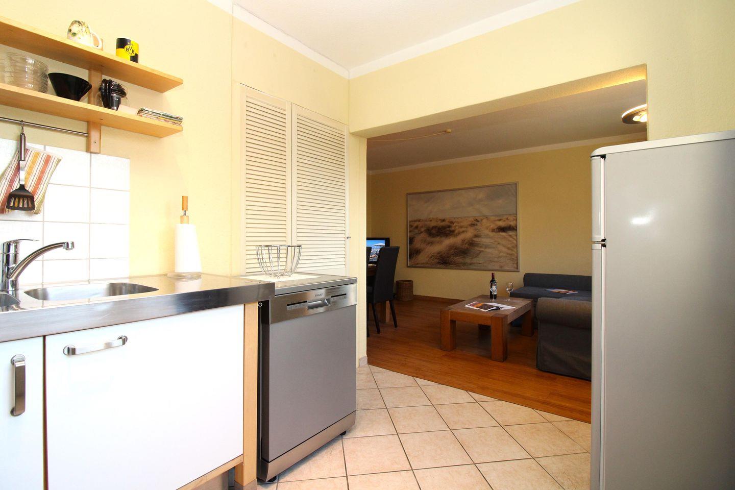 Die halb offene Küche beinhaltet eine voll ausgestattete Einbauküchenzeile mit 4-Zonen-Ceran-Kochfeld, Backofen, Dunstabzug, Mikrowelle, Kühlschrank mit Gefrierfach, Geschirrspülmaschine, Kaffeemaschine, Wasserkocher und Toaster. Die Küche ist mit Geschirr, Gläsern, Besteck und Töpfen komplett ausgestattet.