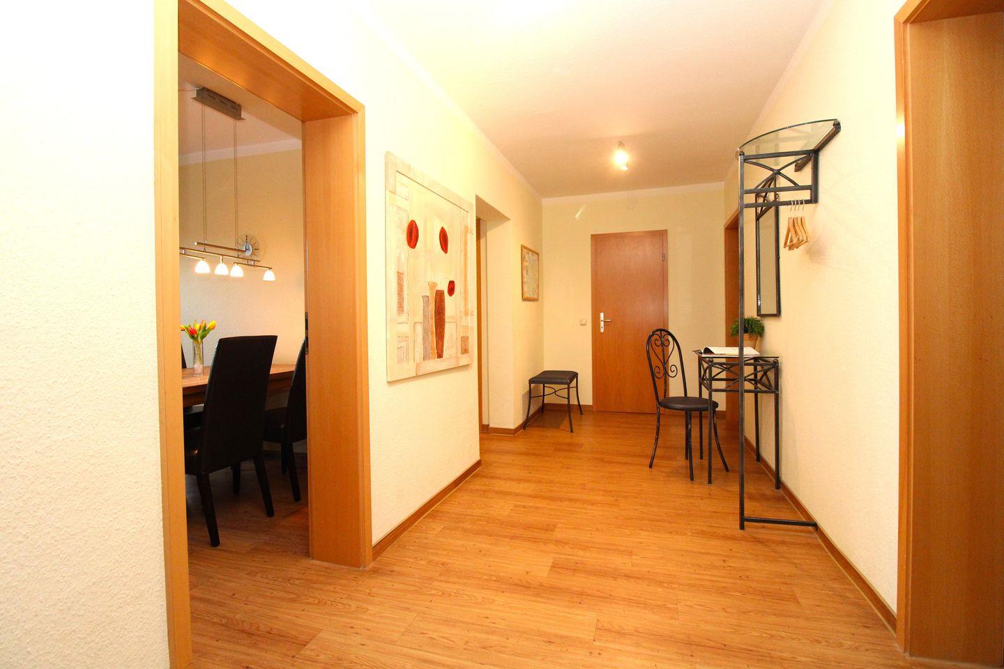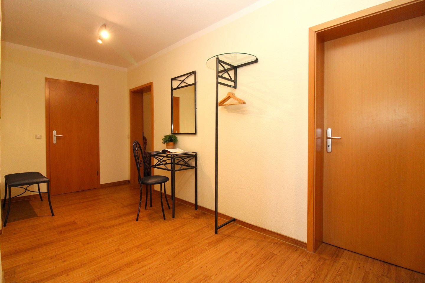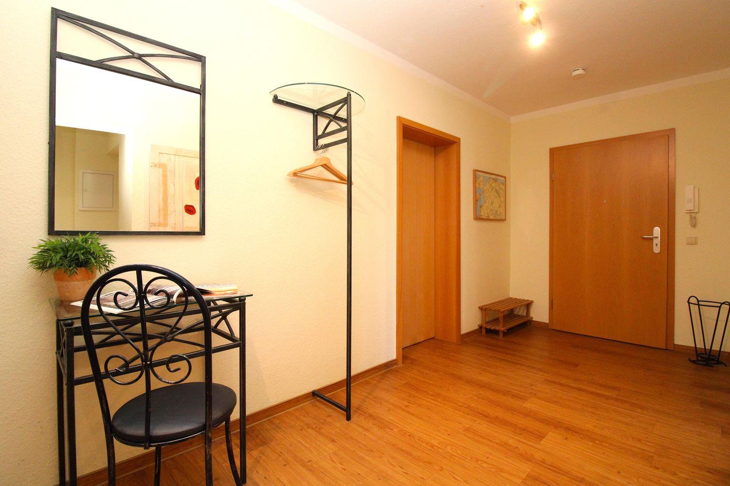 Vom geräumigen Flur mit Garderobe, Schuhablage, Wandspiegel, Sitzbank, kleinem Tisch mit Stuhl sowie einer kleinen Kommode erreichen Sie bequem alle Räume Ihrer Ferienwohnung.