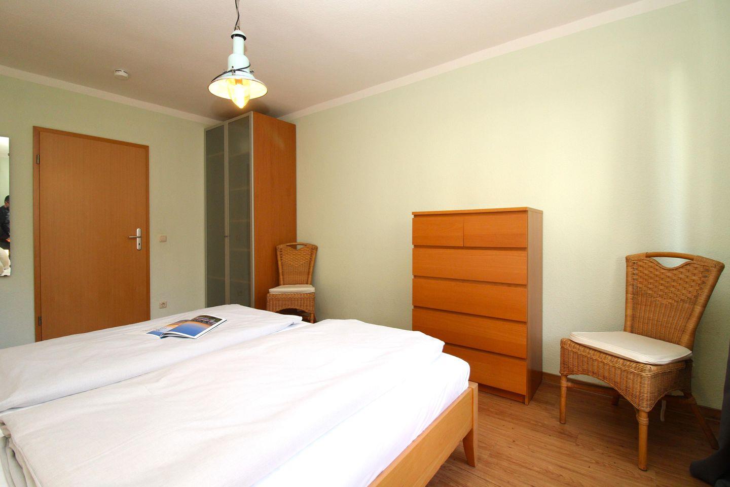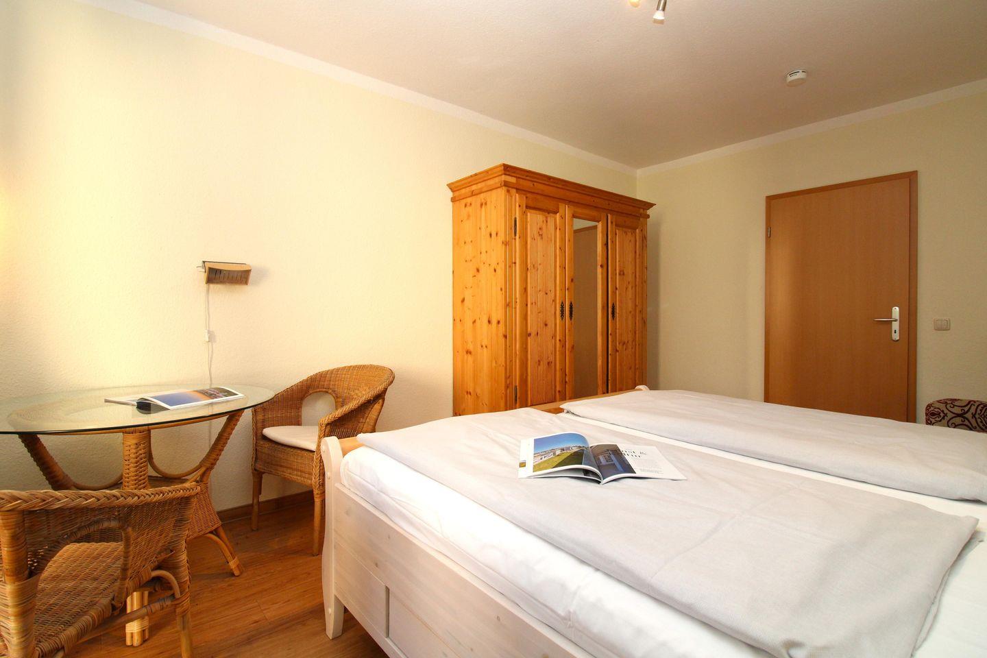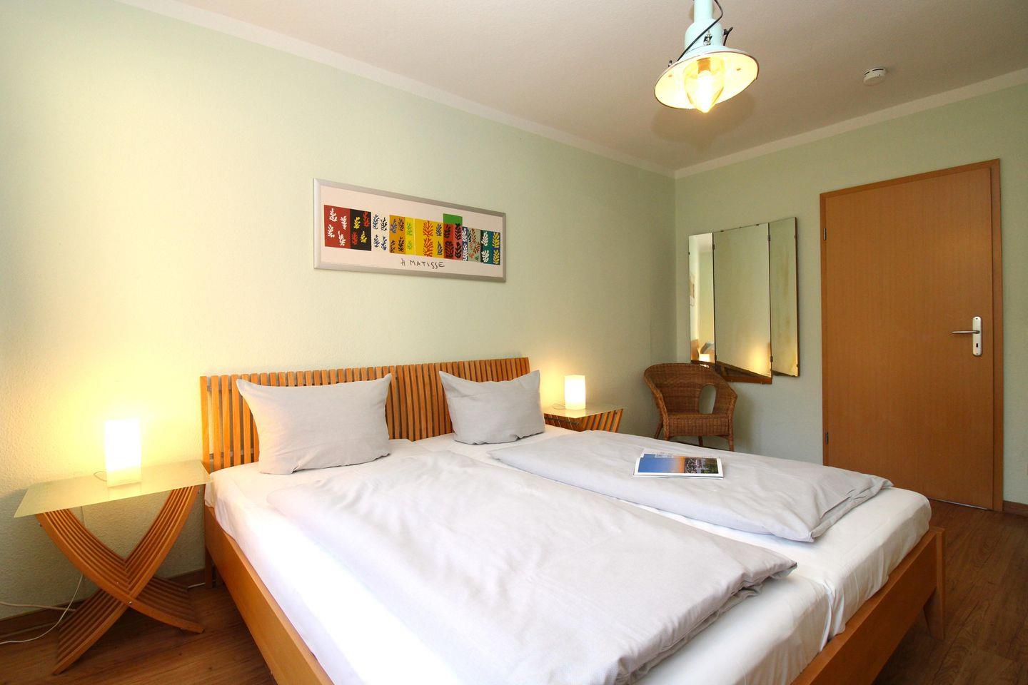 Das separate und zusätzliche 2. Schlafzimmer verfügt ebenfalls über ein bequemes Doppelbett (2 x 90 cm x 200 cm), Nachttische mit Nachttischlampen, einen geräumigen Kleiderschrank, einen bequemen Ohrensessel sowie eine kleine Leseecke mit Tisch und 2 bequemen Korbsesseln.