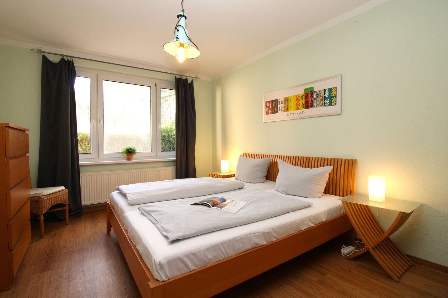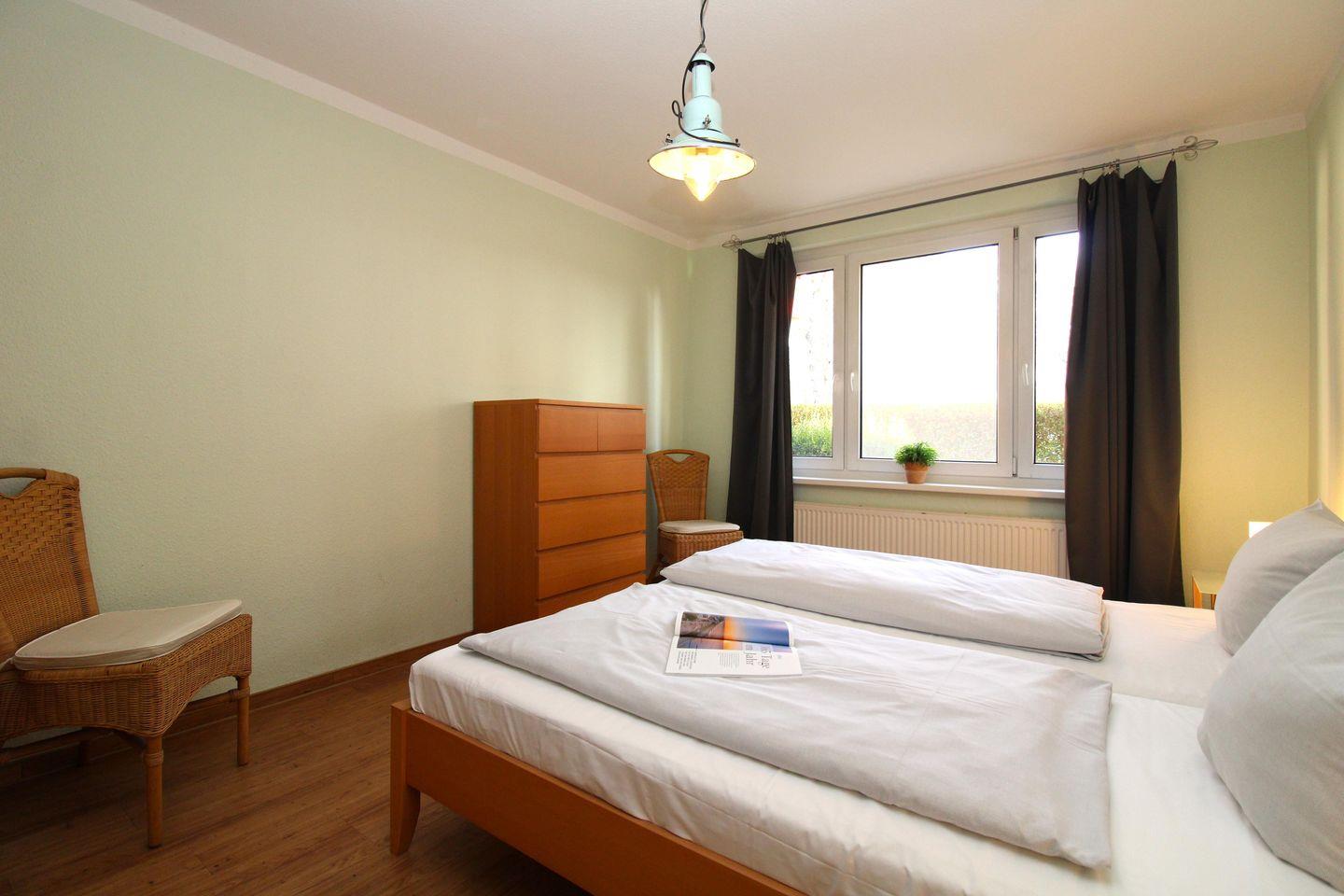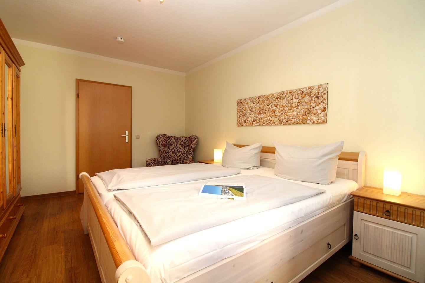 Das separate und zusätzliche 2. Schlafzimmer verfügt ebenfalls über ein bequemes Doppelbett (2 x 90 cm x 200 cm), Nachttische mit Nachttischlampen, einen geräumigen Kleiderschrank, einen bequemen Ohrensessel sowie eine kleine Leseecke mit Tisch und 2 bequemen Korbsesseln.