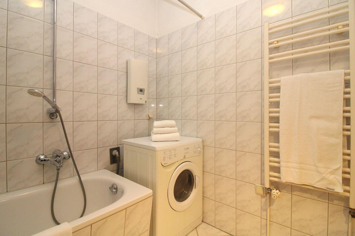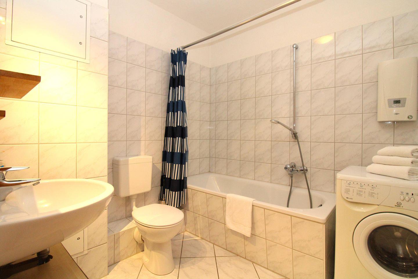 Das Badezimmer verfügt über eine Badewanne mit Duschmöglichkeit, Waschbecken mit Unterschrank, WC, einen Handtuch-Heizkörper sowie ausreichend Ablagemöglichkeiten. Für das Waschen Ihrer Urlaubsgarderobe steht Ihnen hier auch eine eigene Waschmaschine zur Verfügung.