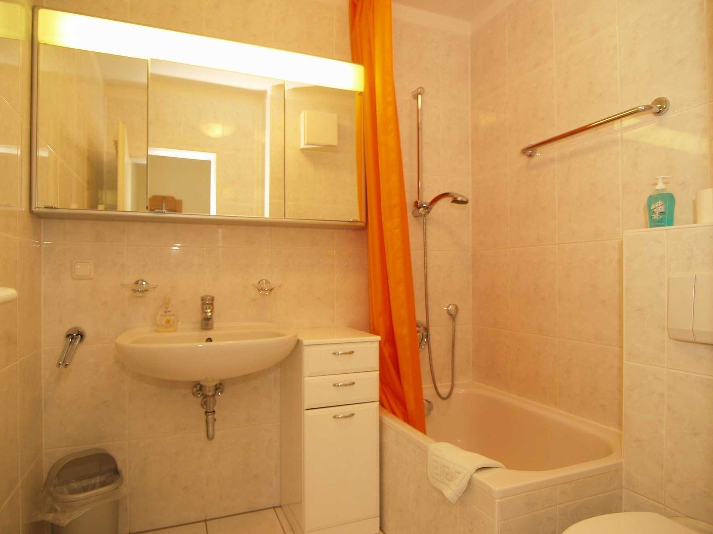 Das freundliche Badezimmer verfügt über eine kleine Badewanne mit Duschmöglichkeit, Waschbecken und WC, Spiegel- sowie Badezimmer-Schrank, Hocker, Handtuch-Heizkörper sowie ausreichend Ablagemöglichkeiten.