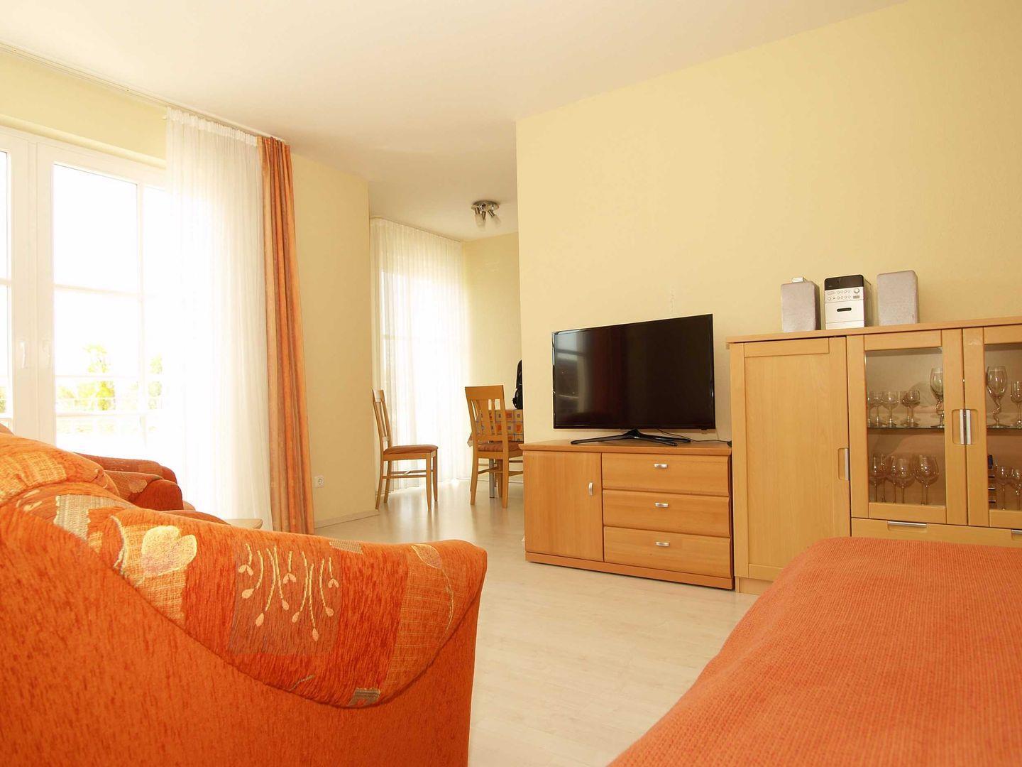 Das großzügige und helle kombinierte Wohn-/Schlafzimmer verfügt über eine separate Sitzgruppe mit bequemer Couch, 2 Sesseln und Couchtisch, ein bequemes Doppelbett (2 x 90 cm x 200 cm) mit Nachttischen sowie eine Kommode und ein Sideboard.