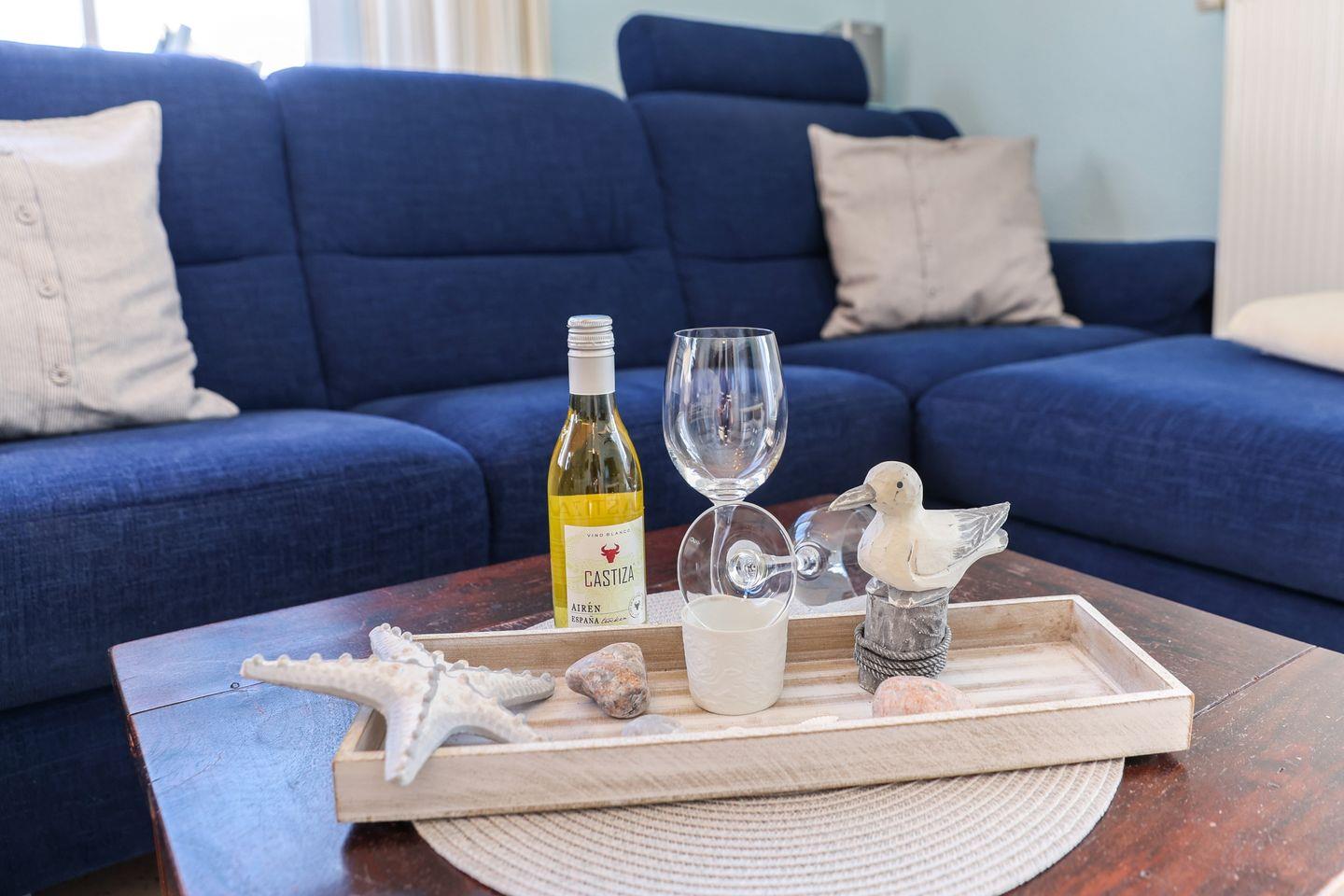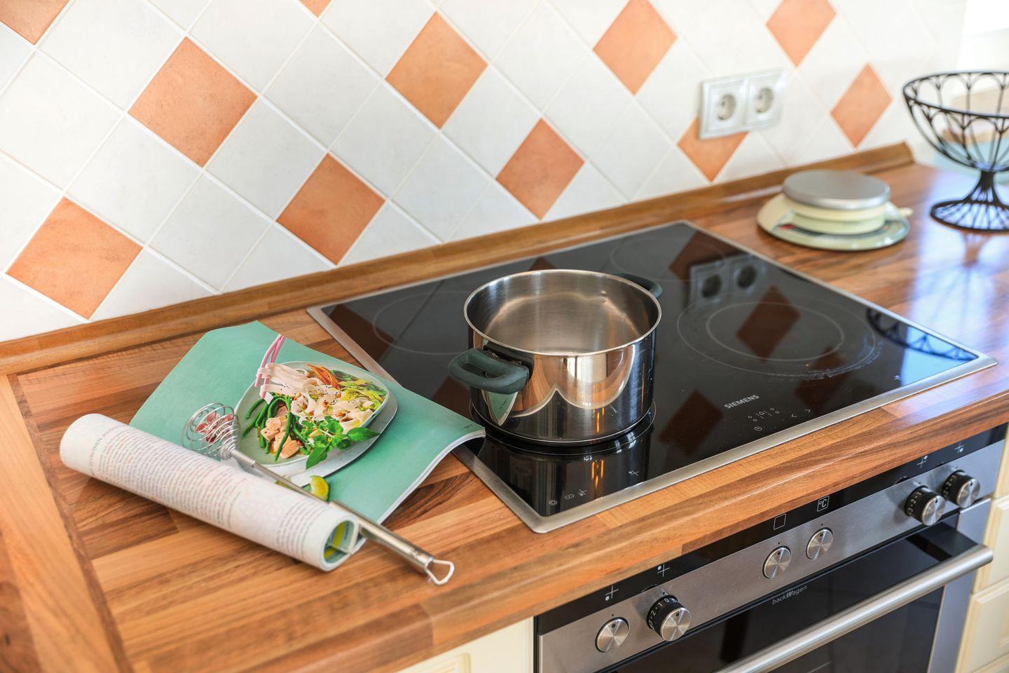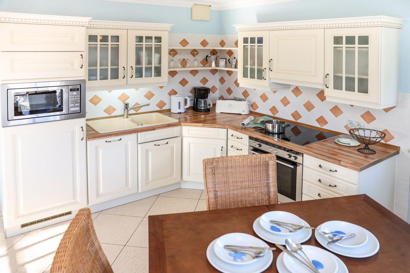 Die moderne Küchenzeile ist im Wohnzimmer integriert und umfasst vier Cerankochfelder, einen Kühlschrank mit Gefrierfach, einen Backofen, einen Geschirrspüler, eine Mikrowelle sowie einen Toaster, eine Kaffeemaschine und einen Wasserkocher. Der Esstisch bietet ausreichend Platz für Mahlzeiten oder Spieleabende.