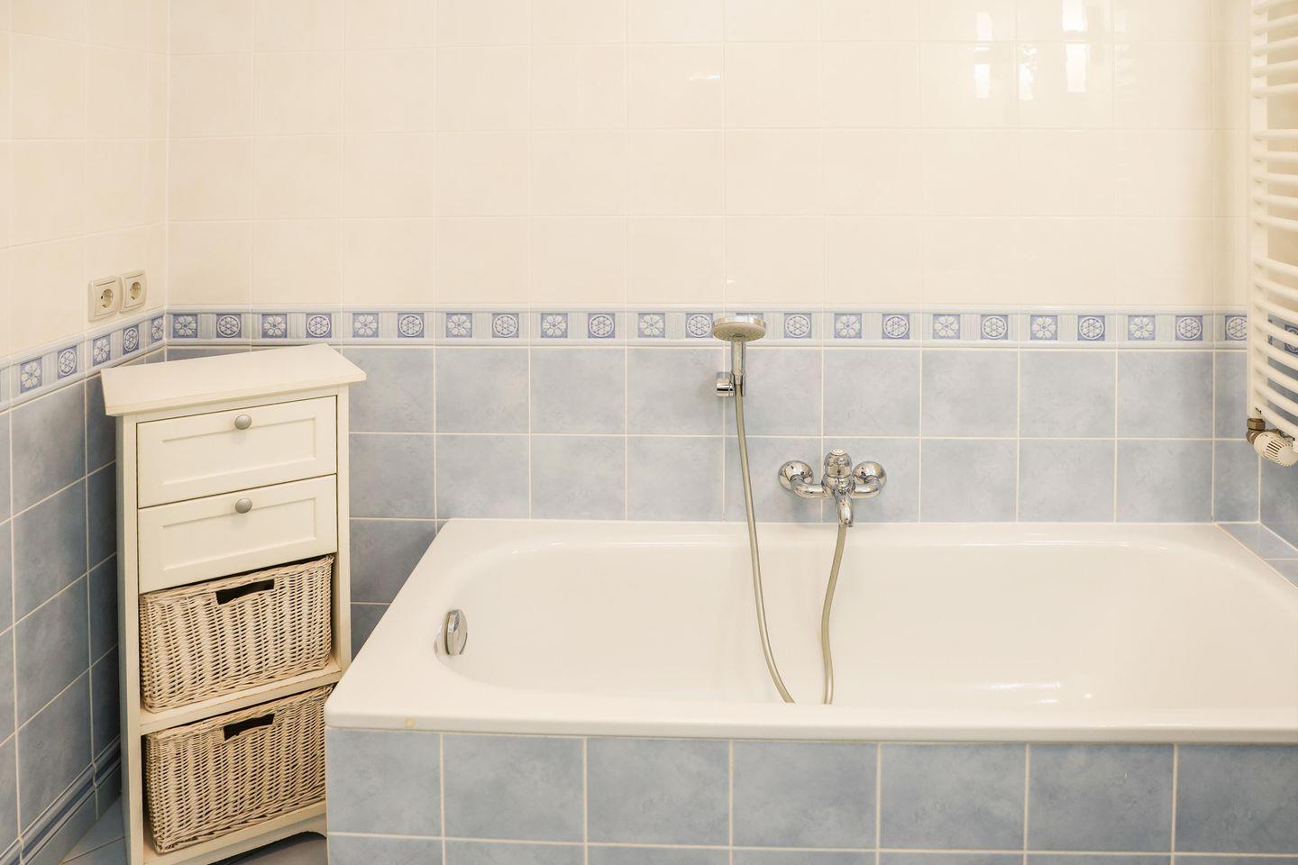 Das Badezimmer verfügt über einen großen Waschtisch, eine Dusche sowie eine Badewanne und Ablagemöglichkeiten.
