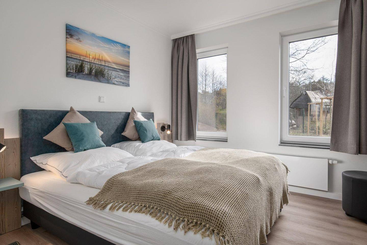 Das Schlafzimmer besitzt ein 1,80 x 2,00 m großes Bett, sowie zwei