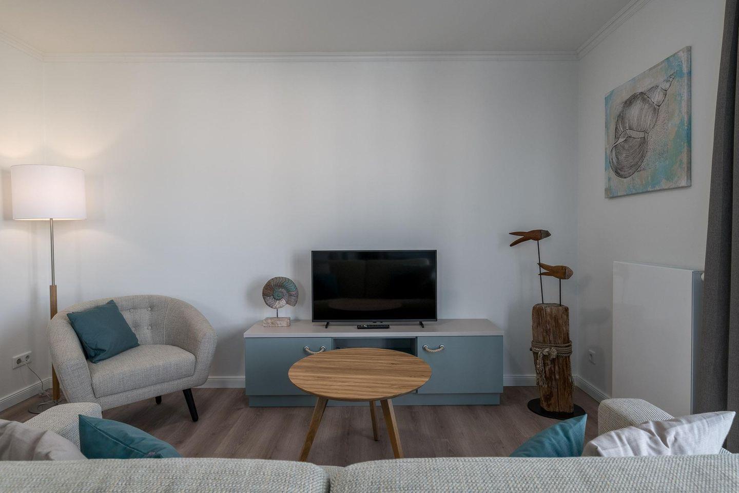 ein kleiner Tisch, einen Smart TV und WLAN.