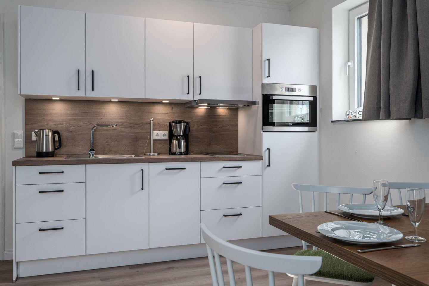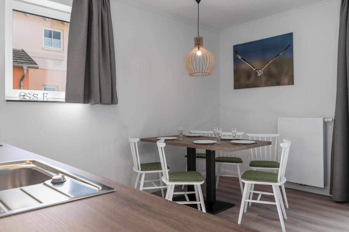 Küche. Zur Sitzgruppe gehören neben dem Schlafsofa noch 3 Sessel, so dass für 6