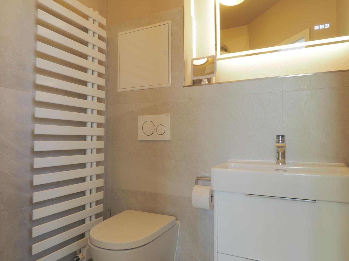 Das moderne Duschbad mit WC und Föhn bietet den nötigen Komfort für einen gelungenen Start in den Tag.
