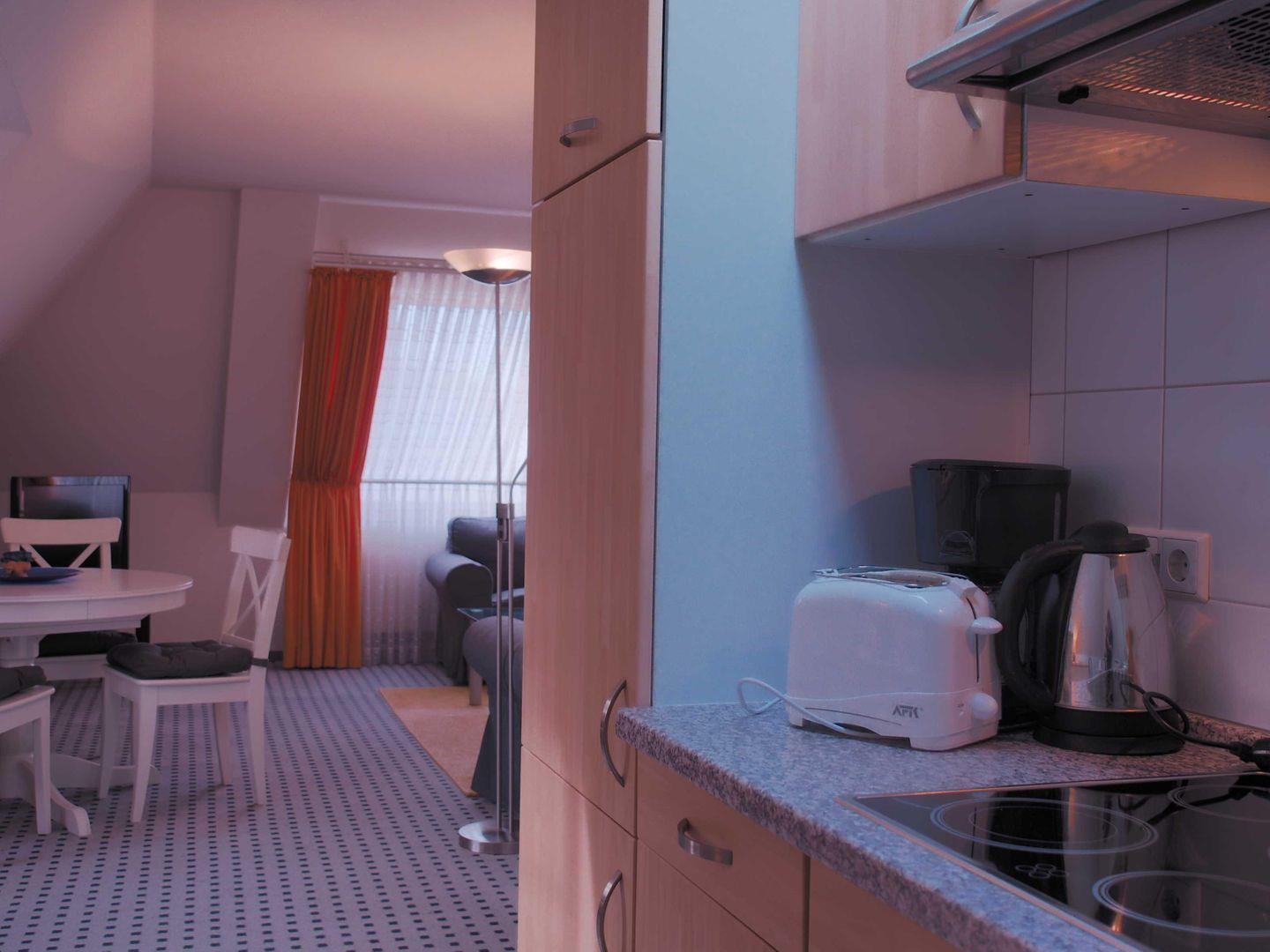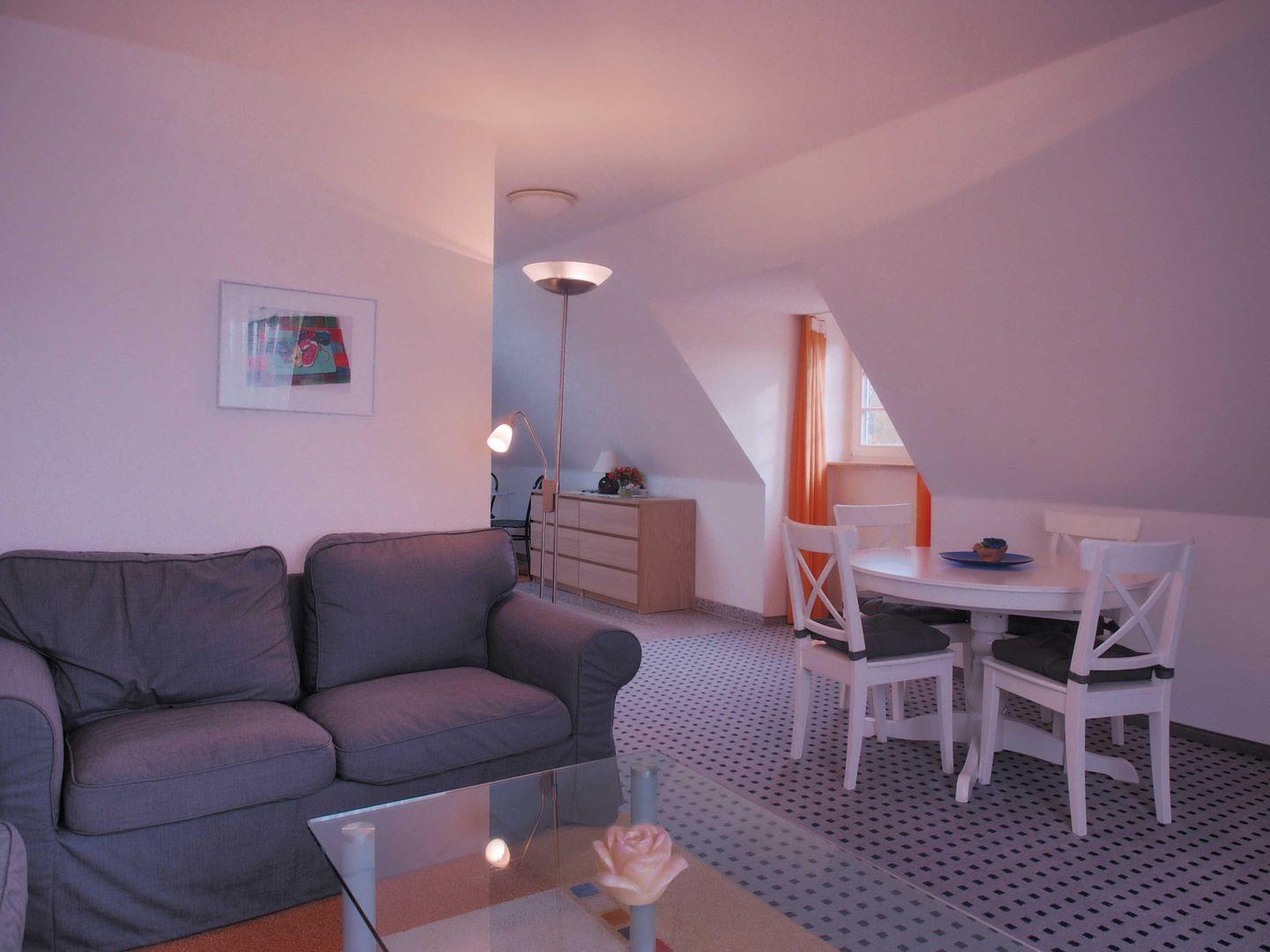 Diese charmante 50m² Ferienwohnung im Dachgeschoss der Residenz Unter den Linden bietet alles, was Sie für einen entspannten Urlaub brauchen. Hier finden 2 Personen und ein Hund Platz. Der offene Wohn-Essbereich mit integrierter Küchenzeile ist der ideale Ort, um gemeinsam zu kochen, zu essen und gemütliche Stunden zu verbringen. Bequeme Sofas und ein TV laden zum Entspannen ein, während der Essbereich Platz für gemeinsame Mahlzeiten bietet.