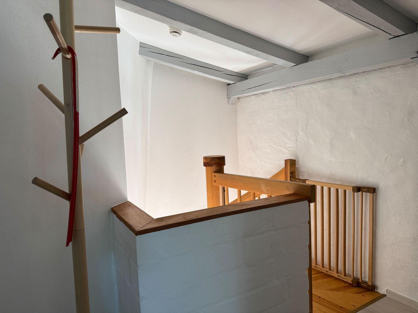 Die Wohnung liegt im ersten Obergeschoss und ist über eine stilvolle Spindeltreppe mit dem separaten Eingangsbereich im Erdgeschoss verbunden. Auf etwa 42 Quadratmetern bietet sie Platz für bis zu vier Personen und ist ideal für Familien, Paare oder einen Urlaub mit Hund geeignet. Der helle Wohnbereich führt direkt auf einen möblierten Balkon, der sich perfekt für ein Frühstück an der frischen Luft oder einen entspannten Abend eignet.