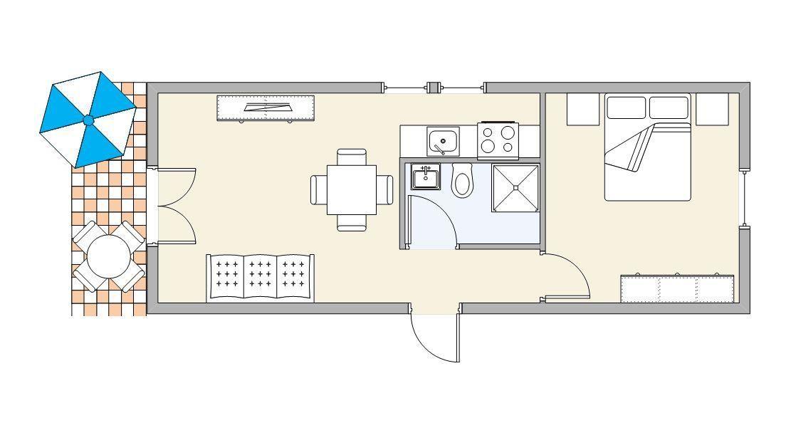 Das separate Schlafzimmer sorgt mit einem komfortablen Schubladenbett, einem Kleiderschrank sowie einer Kommode für genügend Stauraum und erholsame Nächte. Ein modernes Duschbad rundet die Ausstattung ab.