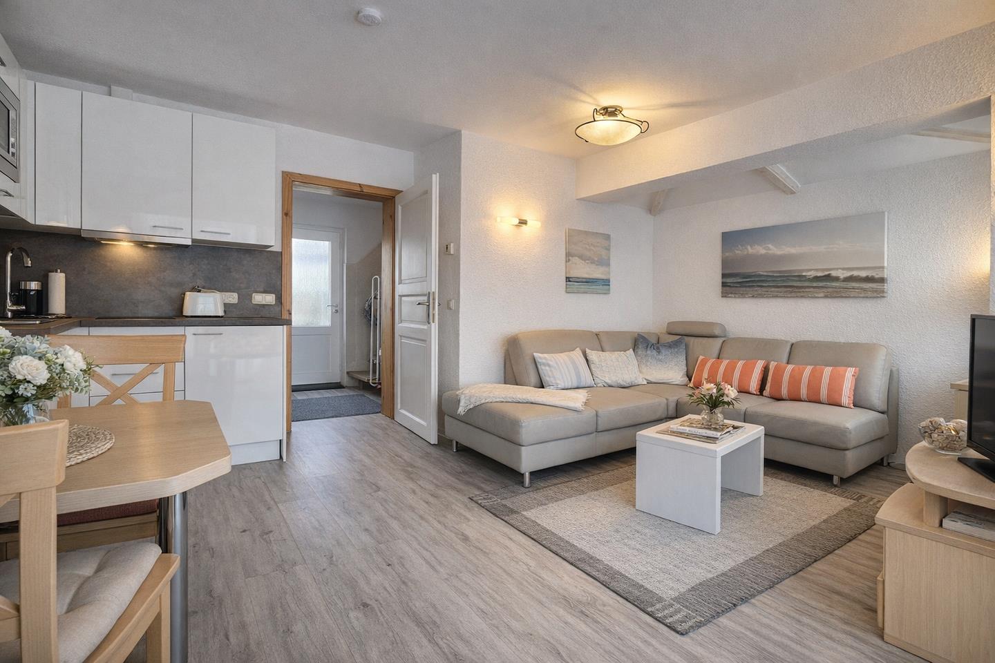 Gemütliche 52m² Doppelhaushälfte auf zwei Etagen, ideal für 2 Erwachsene und 2 Kinder. Mit Wohnzimmer, offener Küche, Essbereich, Bad mit Dusche/WC, Schlafzimmer mit Doppelbett, zweitem Zimmer mit zwei Einzelbetten und Terrasse.
