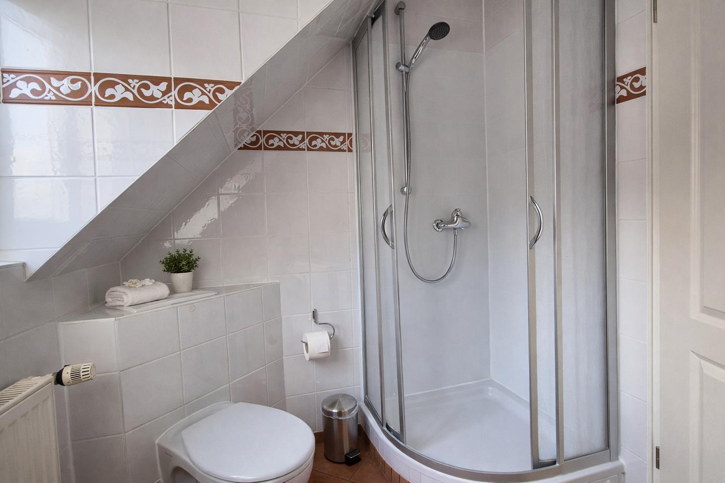 Im Obergeschoss stehen zwei gemütliche Schlafzimmer zur Verfügung, die jeweils mit einem Doppelbett, einem Einzelbett und einem Kleiderschrank ausgestattet sind und zu erholsamen Nächten einladen Das moderne Badezimmer ist mit Dusche, Waschtisch und WC ausgestattet.