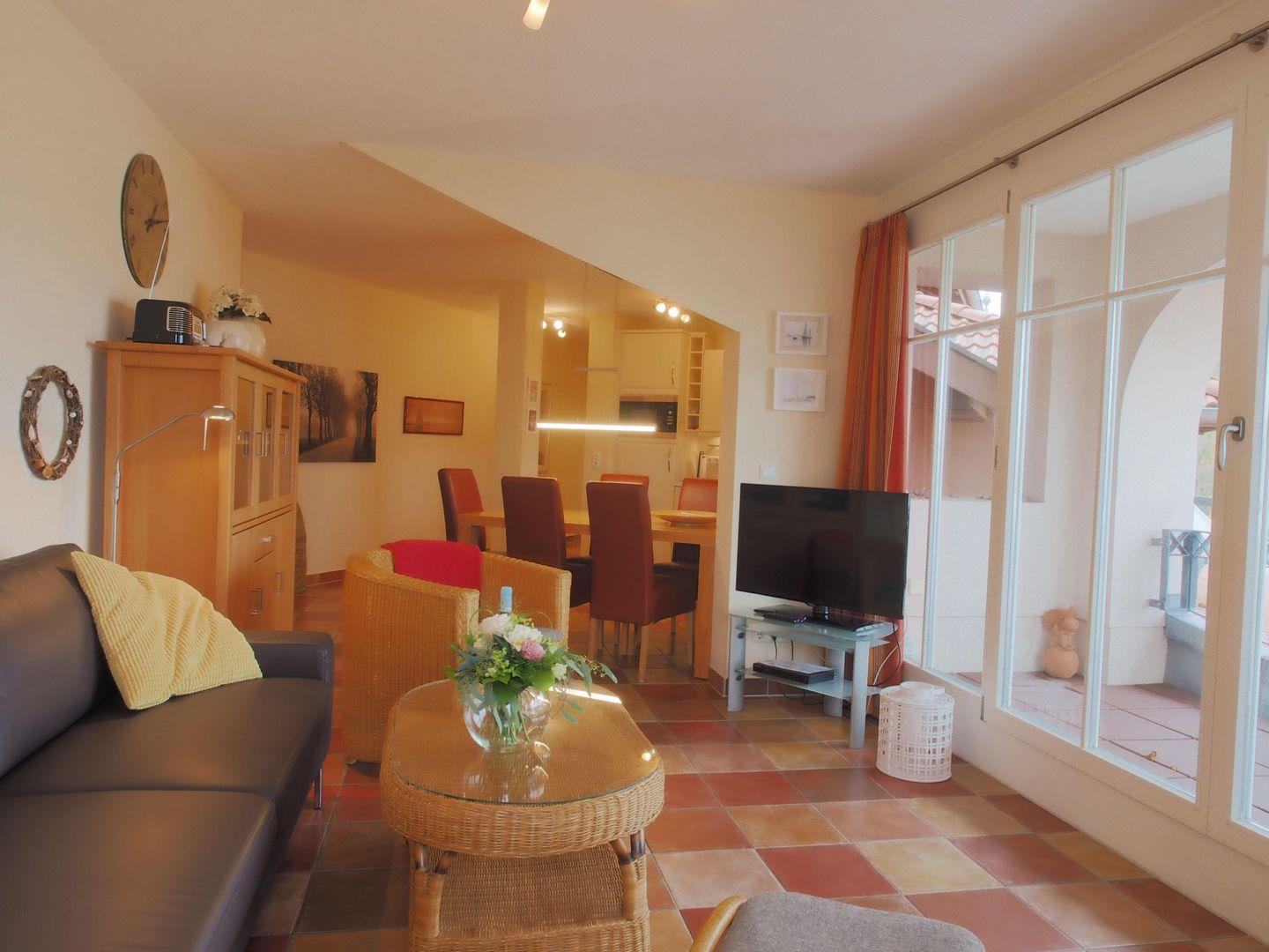 Diese schicke und großzügig geschnittene 76?m² große Ferienwohnung befindet sich im obersten Geschoss eines modernen Neubaus und überzeugt mit viel Licht, Stil und einem ganz besonderen Grundriss. Der Boden ist mit warmen Fliesen in Naturtönen ausgelegt, zahlreiche Fenster durchfluten die Räume mit Tageslicht und schaffen eine angenehme, helle Atmosphäre. Die Wohnung hat Charme, wirkt offen und freundlich – ideal, um sich vom ersten Moment an wohlzufühlen.