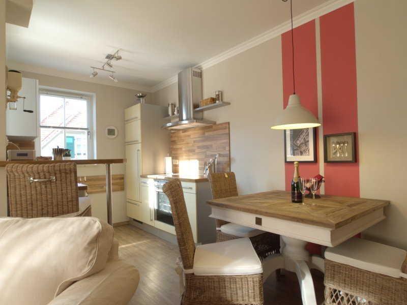 Der großzügige, offene Wohn-Essbereich besticht durch eine helle Atmosphäre, ein gemütliches Sofa mit Sessel und TV, einen Essplatz mit Rattanstühlen sowie eine voll ausgestattete Küche, in der es Ihnen an nichts fehlt – ob für das Frühstück oder das Abendessen zu zweit oder zu dritt.