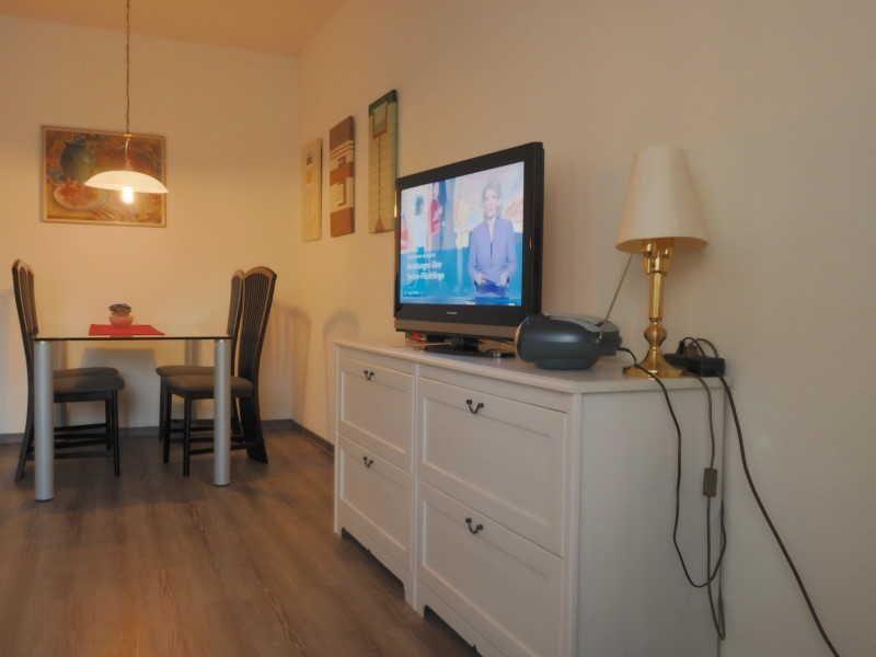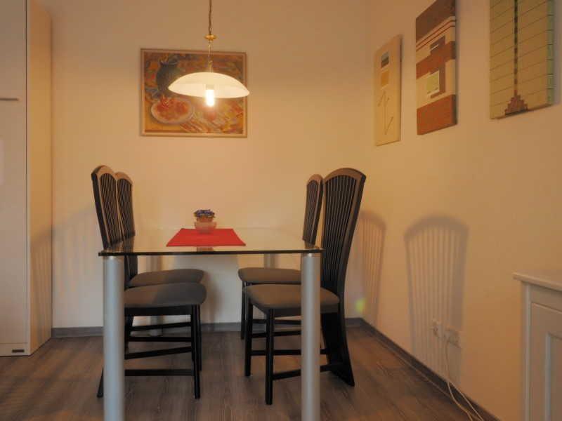 Im großzügigen Wohnzimmer erwarten Sie eine gemütliche Sitzecke mit Couchtisch, ein modernes Sideboard, ein Flachbild-TV sowie ein praktisches Schrankbett – ideal für erholsame Nächte. Der angrenzende Essbereich mit großem Tisch und vier Stühlen lädt zu geselligen Mahlzeiten ein.