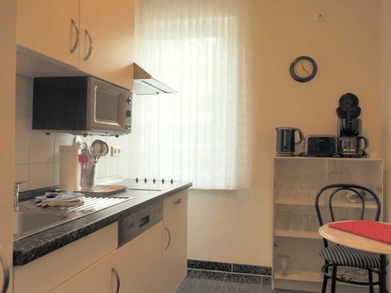 Die separate Küche ist voll ausgestattet mit Kühlschrank, Ceranfeld-Herd, Mikrowelle, Kaffeemaschinen und Wasserkocher. Eine charmante kleine Frühstücksecke mit Bistrotisch macht den Morgen besonders angenehm.