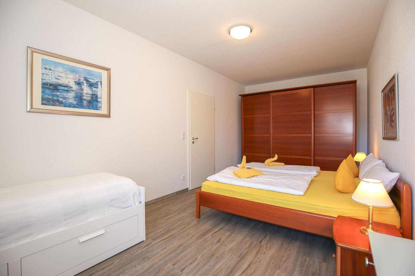 Das sehr großzügige Schlafzimmer bietet ideale Schlafmöglichkeiten für bis zu drei Personen – ausgestattet mit einem komfortablen Doppelbett und einem Einzelbett, dazu ein großer Kleiderschrank für reichlich Stauraum.