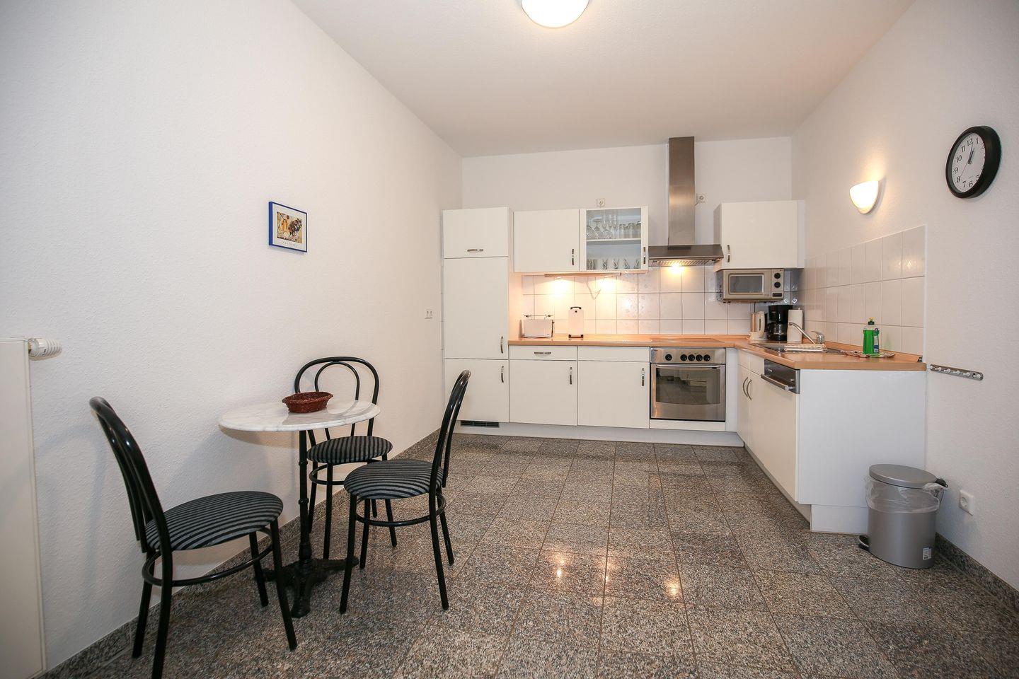 Die offene, voll ausgestattete Küche lässt keine Wünsche offen: Ceranfeld, Backofen, Spülmaschine, Mikrowelle, Kühlschrank mit Gefrierfach sowie zahlreiche Küchengeräte und viel Geschirr stehen bereit. Für den perfekten Start in den Tag gibt es zusätzlich einen kleinen Frühstücksbereich mit Bistrotisch und Stühlen.