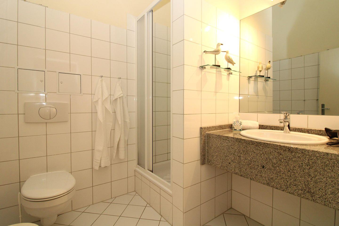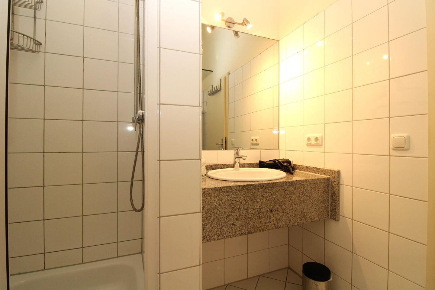 Das Badezimmer verfügt über eine Dusche, ein Waschbecken mit großem Wandspiegel, WC, einen Hocker, Föhn sowie ausreichend Ablagemöglichkeiten.