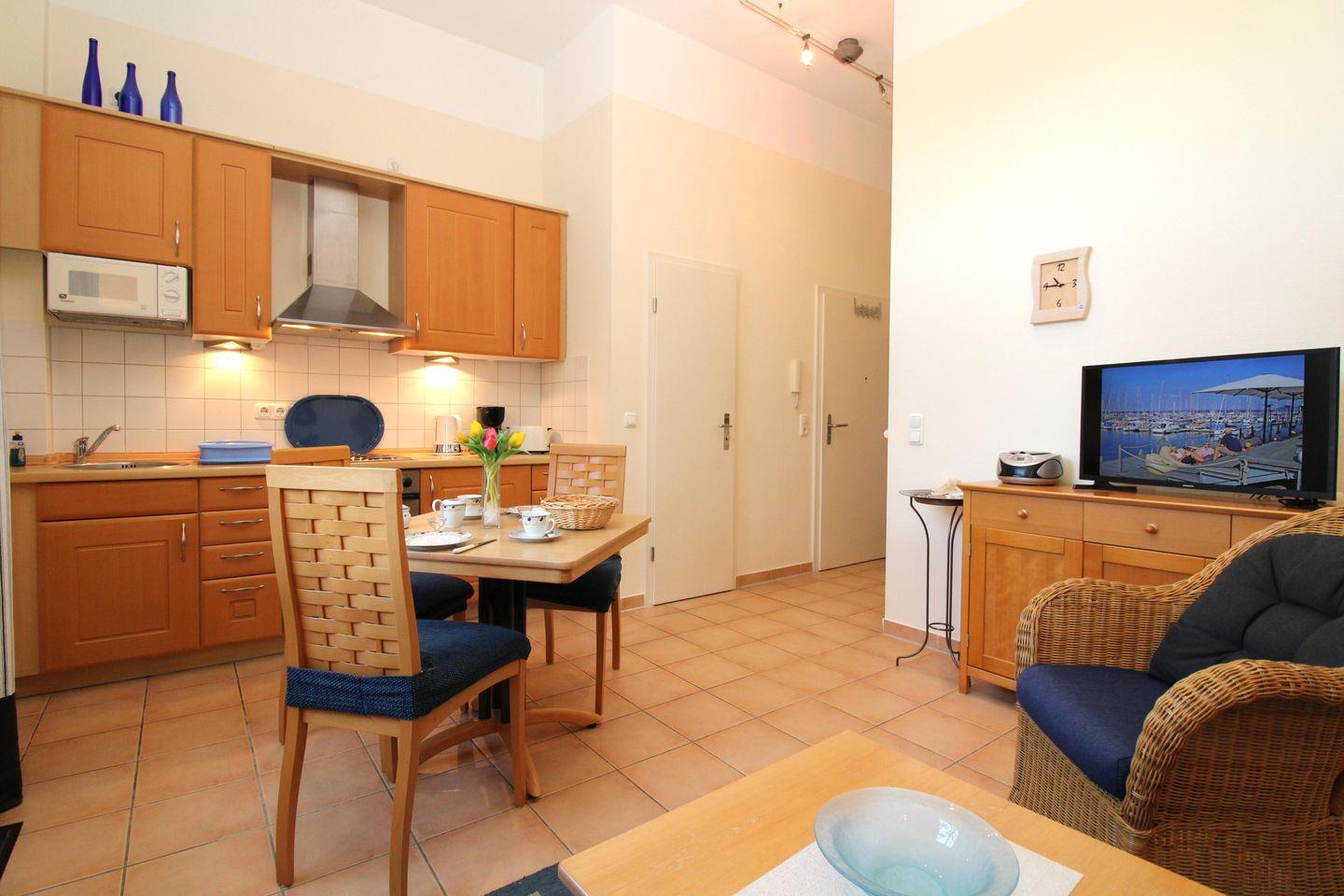 Die strandnahe 2-Zimmer-Wohnung (ca. 41 m²) im Erdgeschoss bietet einen funktionalen Grundriss und ist komplett eingerichtet. Alle Fußböden der Wohnung sind mit wohnlichen terracottafarbenen Fliesen versehen.